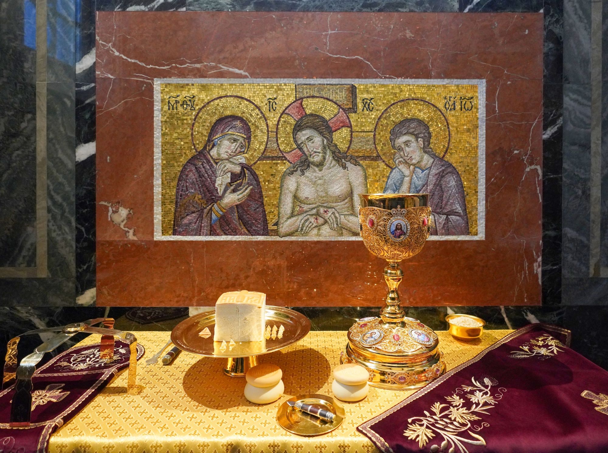 Этот евангельский сюжет лёг в основу иконы «Положение во Гроб». Она рассказывает о событиях Страстной пятницы: снятии Спасителя со Креста, оплакивании и Его погребении. В наших храмах такие образы можно увидеть над жертвенником в храме святого Георгия Победоносца и криптовом храме Сорока мучеников Севастийских. А также — в росписи Филиппова придела.
