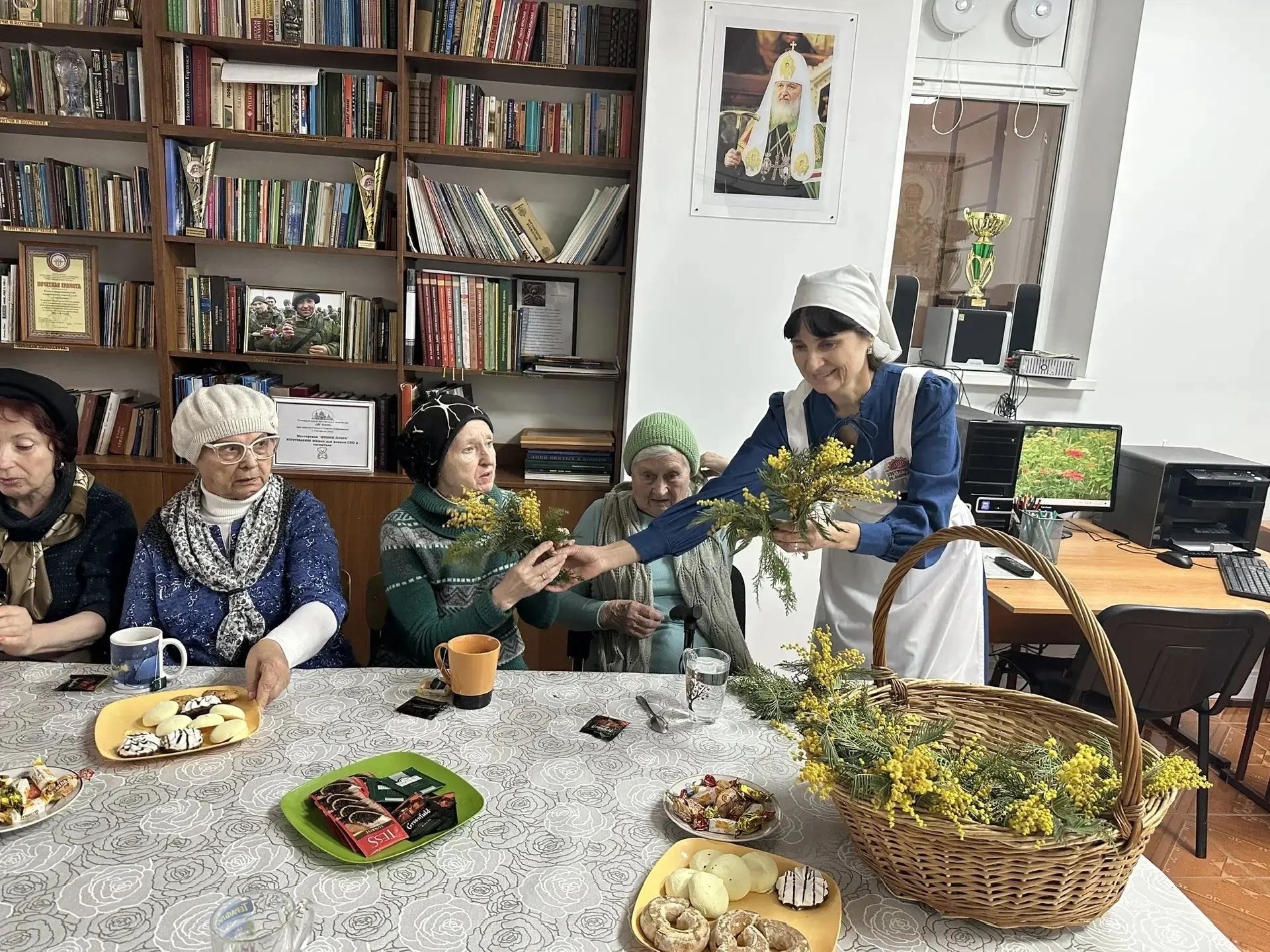 В этот же день наш приход радушно встретил гостей из Центра социального обслуживания населения Советского района. Участники клуба пенсионеров «Оптимист» познакомились с историей, архитектурой, особенностями убранства и святынями приходских храмов. Общение продолжилось за чаепитием и просмотром презентации «Твори добро». В завершение встречи каждый гость получил небольшой букетик мимозы — как напоминание об истинном смысле Великого поста: расцветании души через благодать Божию.