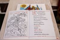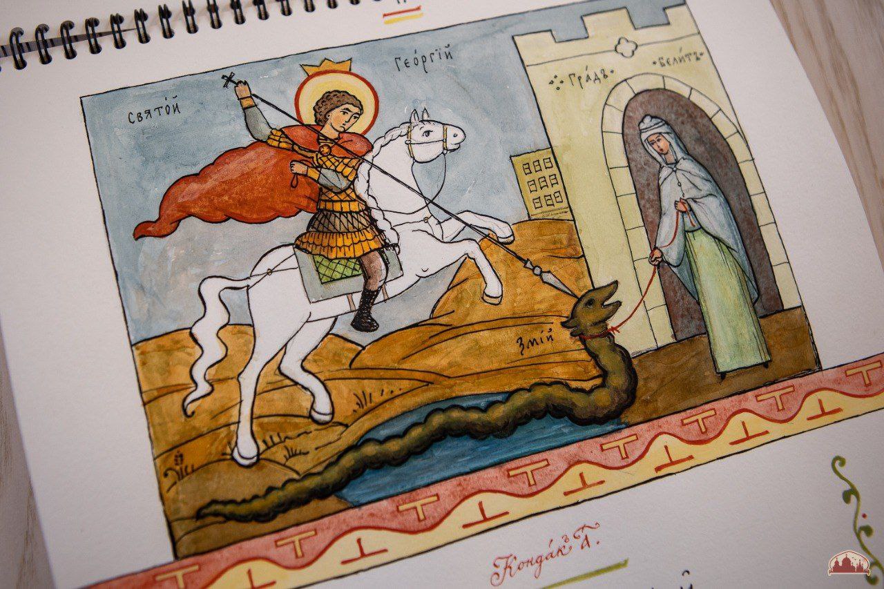Целый год ученики воскресной школы под руководством преподавателя Юлии Борисовой трудились над созданием иллюстраций и орнаментов к акафисту. Тщательная проработка и анализ теста, подбор эскизов, цветовой гаммы заняли продолжительное время. Но этот благодатный труд был всем в радость. Посильную помощь в создании рукотворного издания оказал иконописец-шрифтовик приходской иконописной мастерской Георгий Дудко, чьи каллиграфические тексты придали особую ценность. В конце добавлена вкладка с прорисью иконы святого Георгия для самостоятельного раскрашивания.