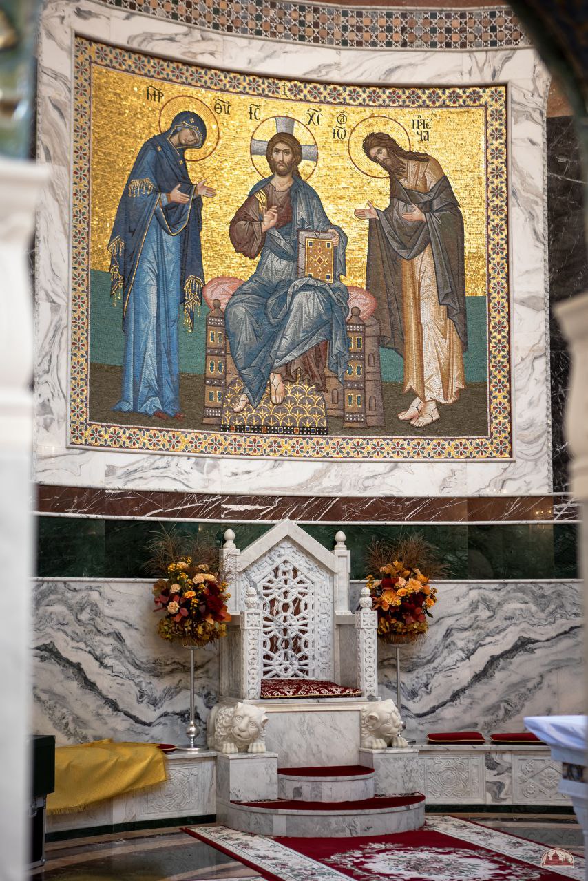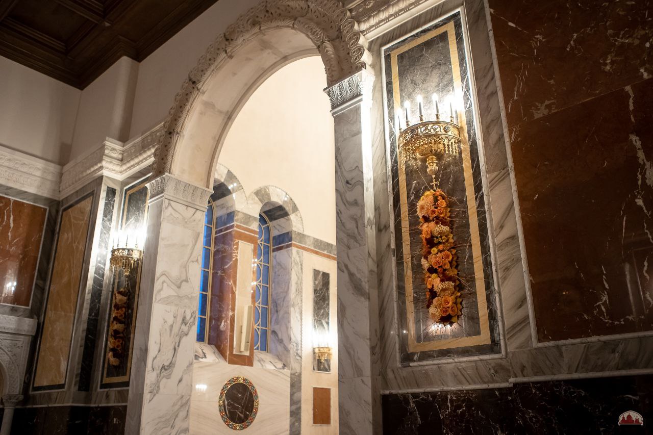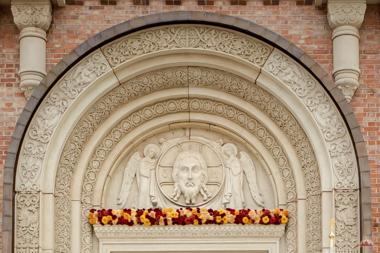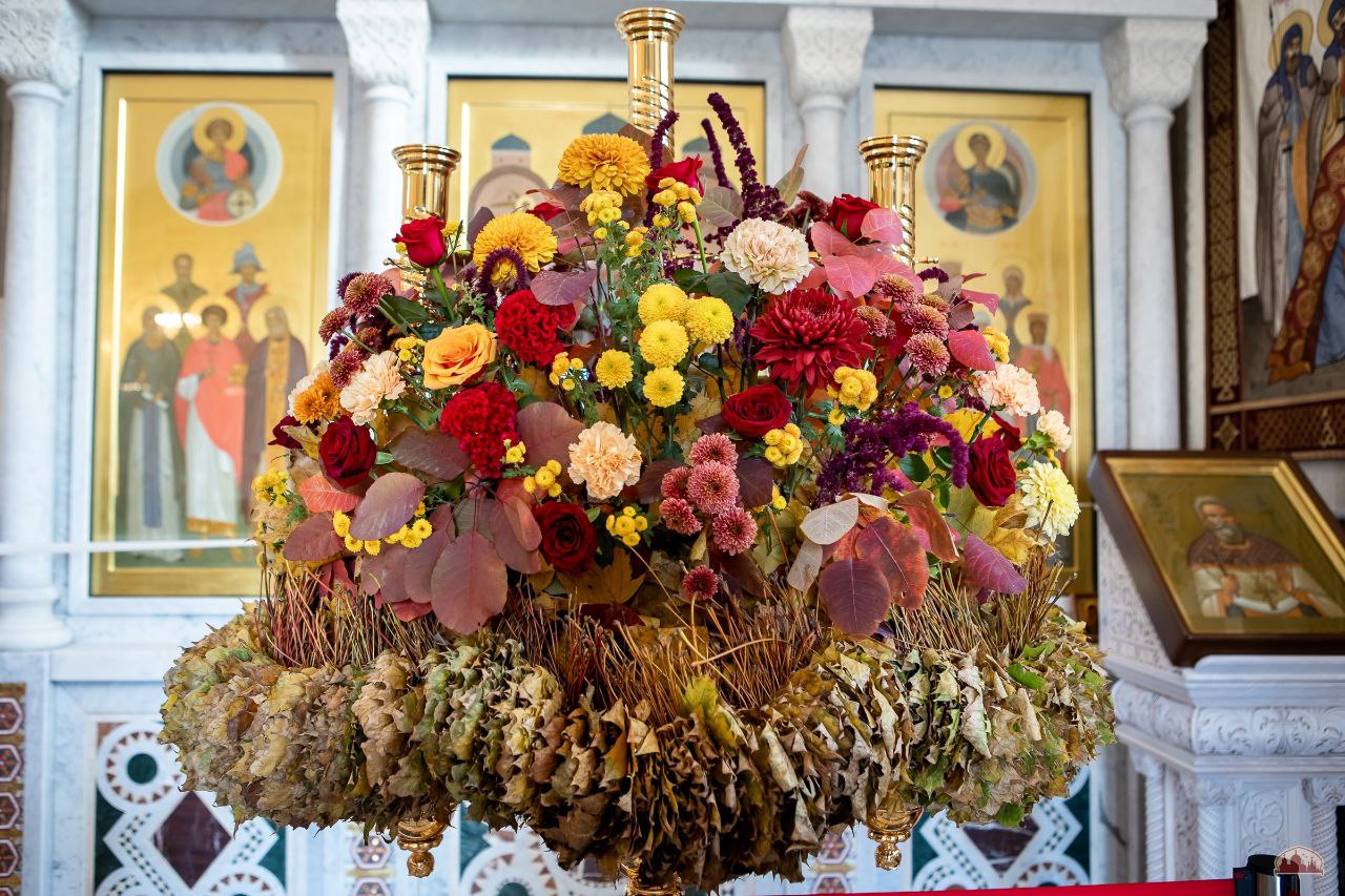 Торжественное осеннее убранство к великому освящению подготовили наши прихожане во главе с Валерией Букиной - мастером-флористом международного класса. Кленовые листочки собирали всем приходом.