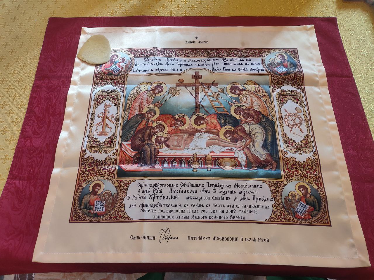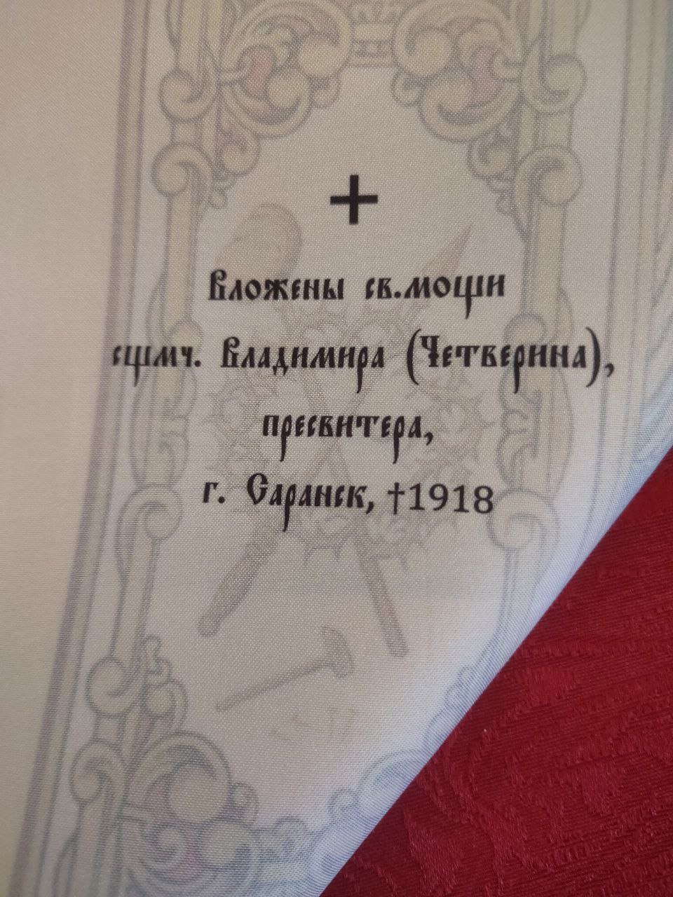 В святой Антиминс новоосвящённого храма Георгия Победоносца вложена частица мощей священномученика Владимира Четверина.