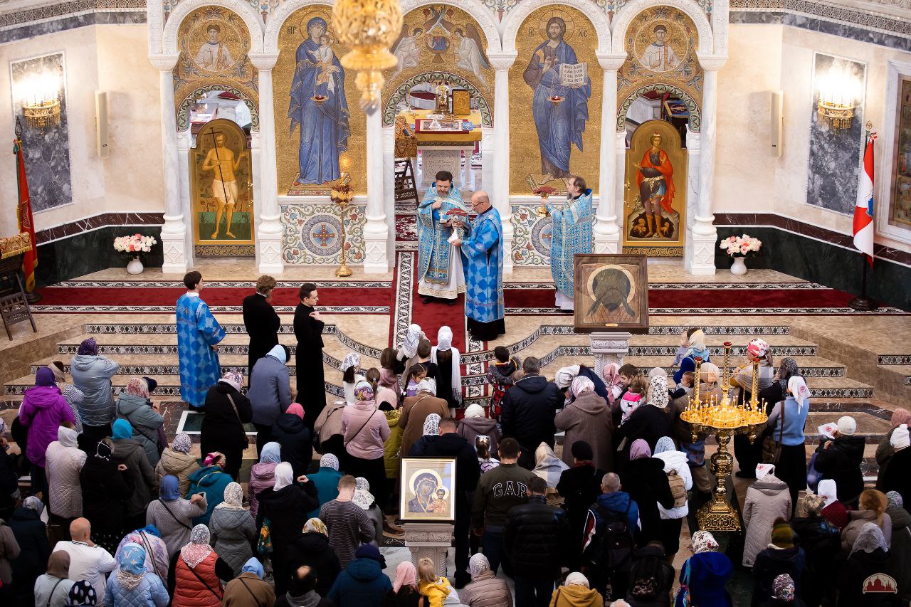 Заступница усердная, Матерь Господа Всевышнего, за всех молишь Ты Сына Твоего, Христа Бога нашего, и содействуешь спасению всех, под мощный Твой покров прибегающих. Всех нас защити, о Госпожа, Царица и Владычица, пребывающих в напастях, и скорбях, и болезнях, обремененных грехами многими, предстоящих и молящихся Тебе с умиленною душою и сокрушенным сердцем, пред пречистым Твоим образом со слезами, и имеющих твердую надежду в Тебе на избавление от всех зол. Всем полезное даруй и всех спаси, Богородица Дева, ибо Ты – Божественный покров рабам Твоим.