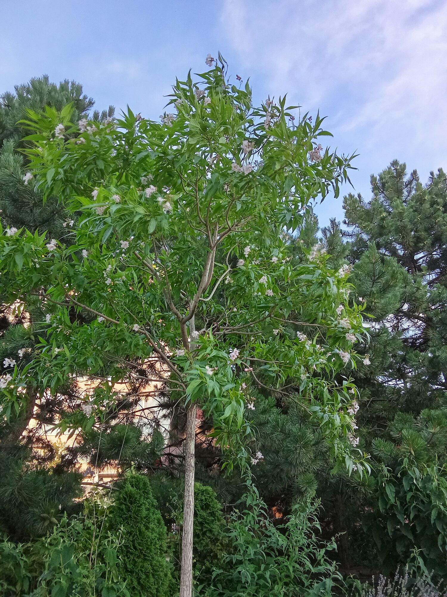Описание: Гибрид, полученный с помощью перекрёстного опыления хилопсиса линейного и катальпы бигнониевидной в 1964 году ботаником Николаем Фёдоровичем Русановым в ботаническом саду Ташкента. Небольшое дерево, может достигать 4-6 метров в высоту. Сочетает в себе декоративные свойства хилопсиса с неприхотливостью катальпы. Листья тёмно-зелёные, ланцетовидные, длиной до 22 сантиметров и шириной от 4 до 5 сантиметров. Имеет очень долгий период цветения - с июня (в Узбекистане - с апреля) до первых заморозков. Цветы собраны в метельчатые соцветия, от 12 до 20 сантиметров в длину. Плоды - зеленые бобы-стручки.