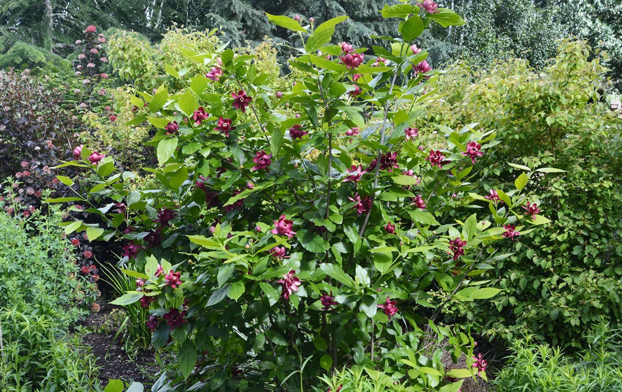 Описание: Декоративный листопадный кустарник с крупными бордовыми или розовыми цветками, напоминающими лотосы с невероятным запахом. Кусты зацветают уже в начале июня и продолжают радовать своим видом вплоть до осени. Приятный запах источают кора, древесина и листва каликантуса. Широко используется в парфюмерии.