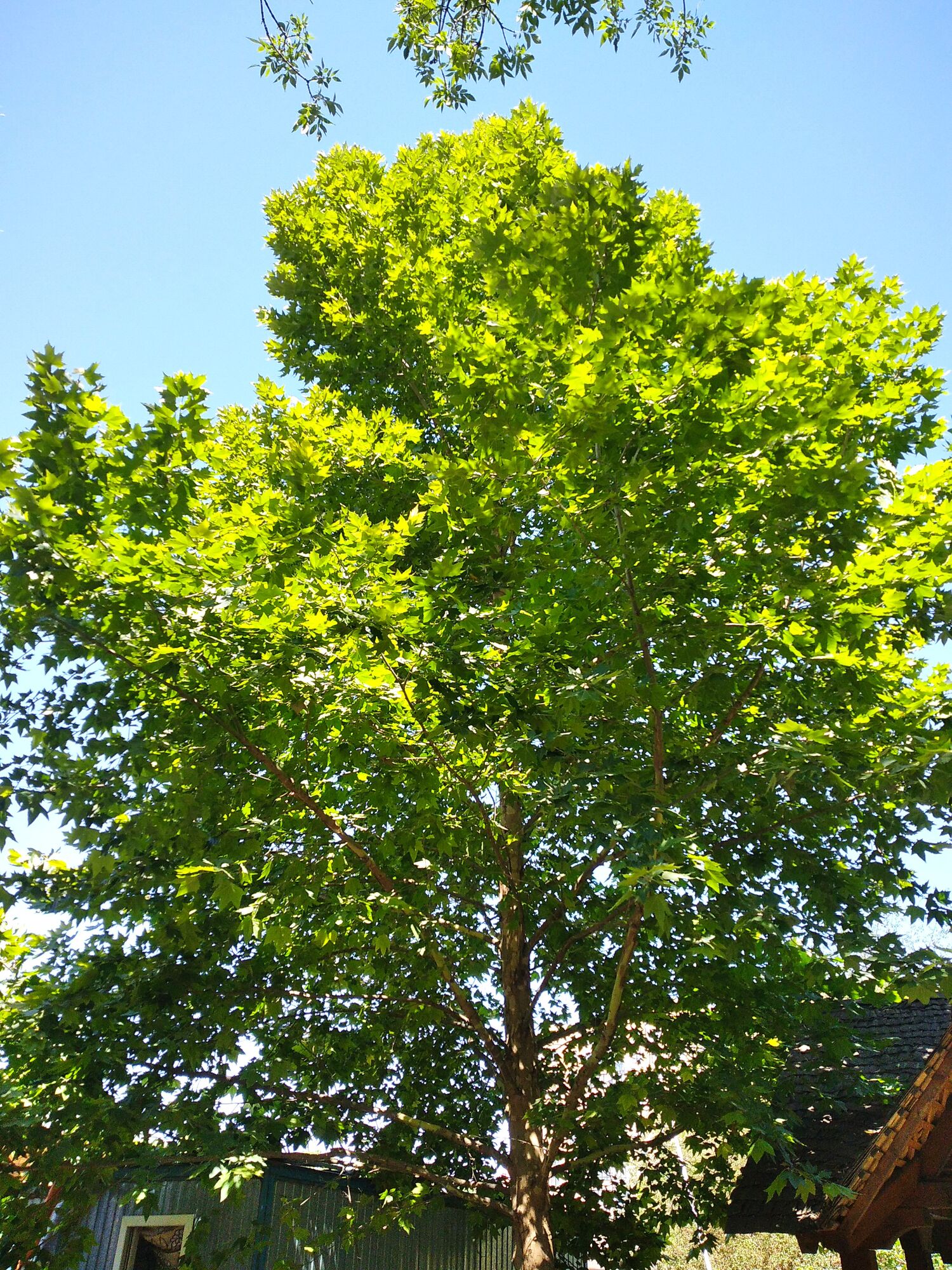 Описание: Гибридный вид деревьев рода платан высотой до 40м с прямым высоким стволом и довольно широкой раскидистой кроной с повисающими нижними ветвями. Кора на стволе отделяется крупными пластинками. Листья длиной 15-17см, в основном пятилопастные. Плодовые головки диаметром около 3 см, щетинистые, обычно по две, редко одиночные или по три. Семянки опушённые, с широко-конической голой верхушкой и долго сохраняющимся столбиком.
