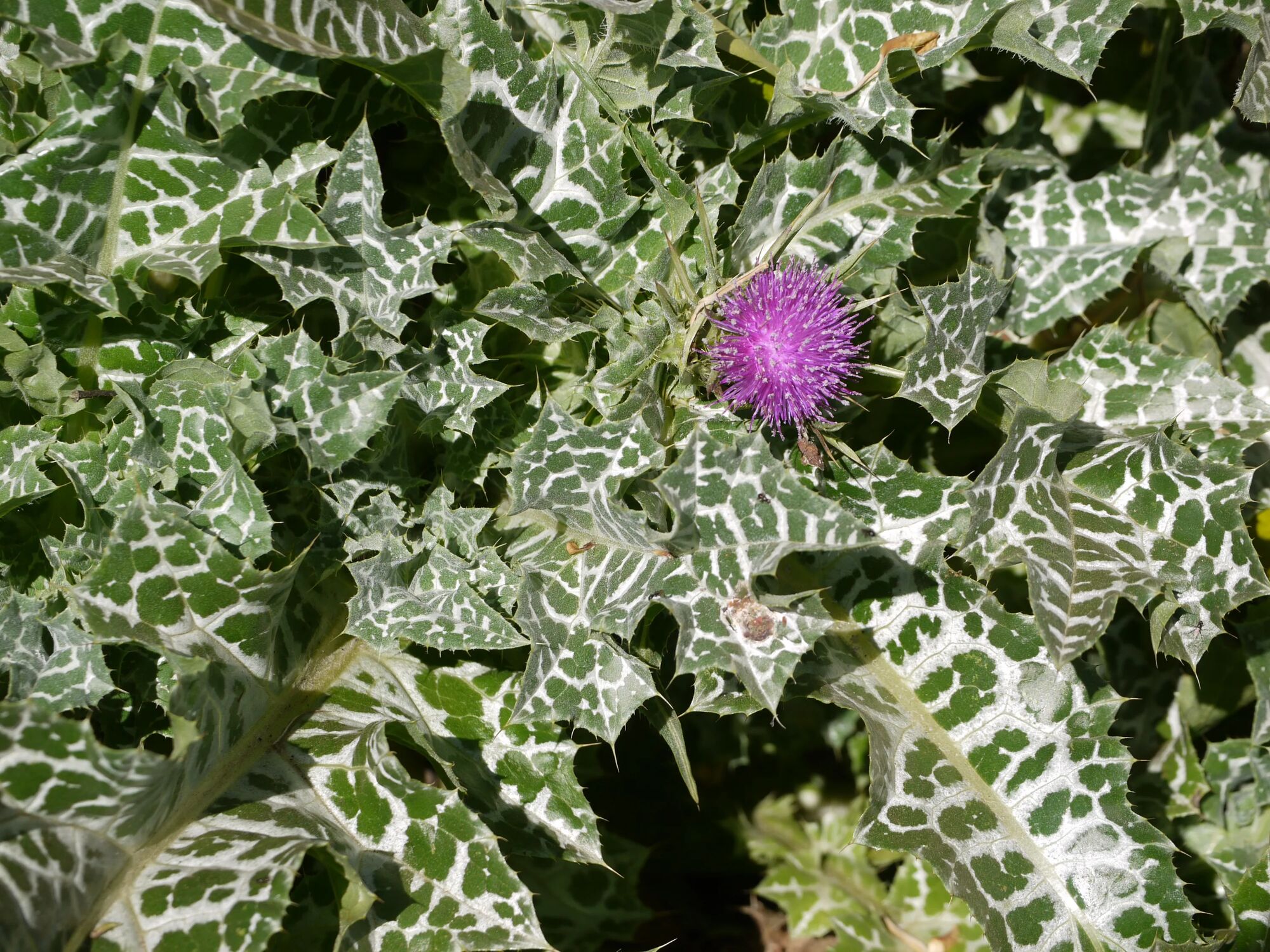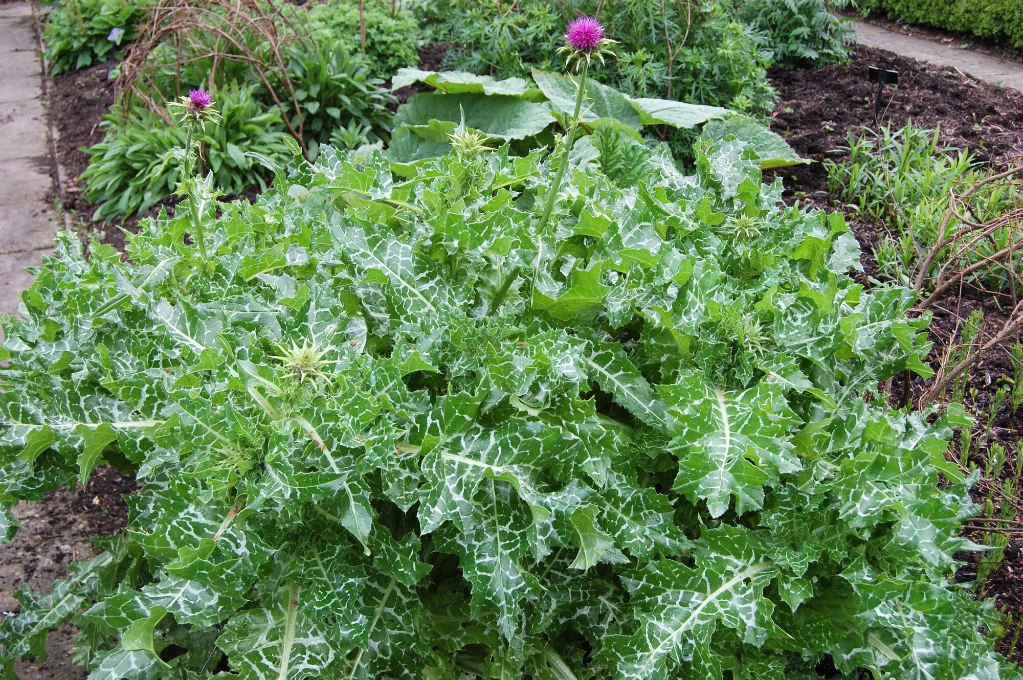 Описание: Однолетнее (в культуре) или двулетнее чрезвычайно колючее лекарственное растение высотой 1—1.5 м. Очень необычные листья: пластинка листа зеленая, а на ней белые пятна, продолговатые разводы. Плод-семянка с хохолком, летучий, пятнистый. Семена содержат силимарин — комплекс мощных природных антиоксидантов. Их используют для профилактики и лечения заболеваний печени, жёлчного пузыря, жёлчных путей и многих других. Из семян расторопши делают препарат Карсил. А также продают размолотые семена в виде таблеток.