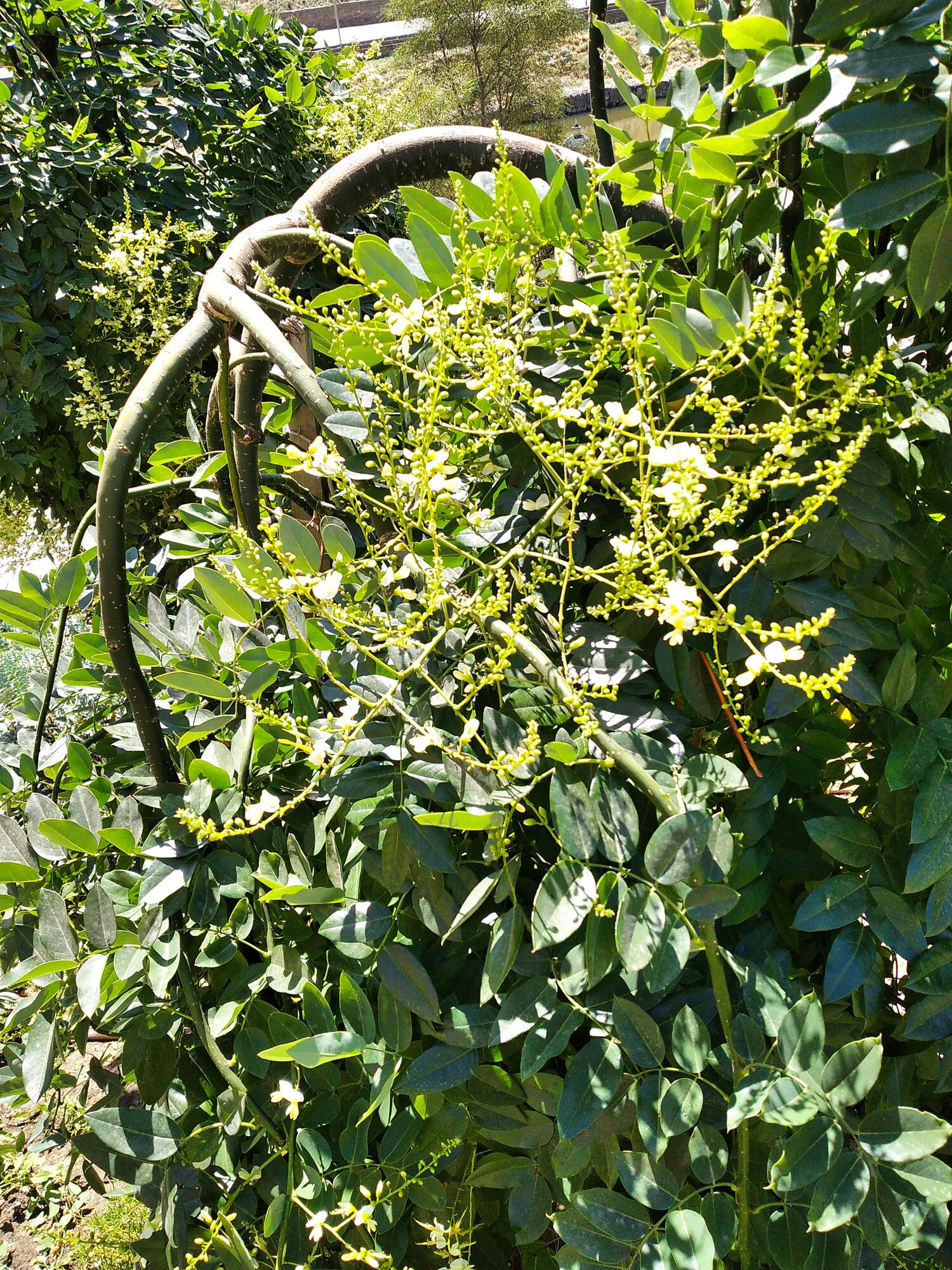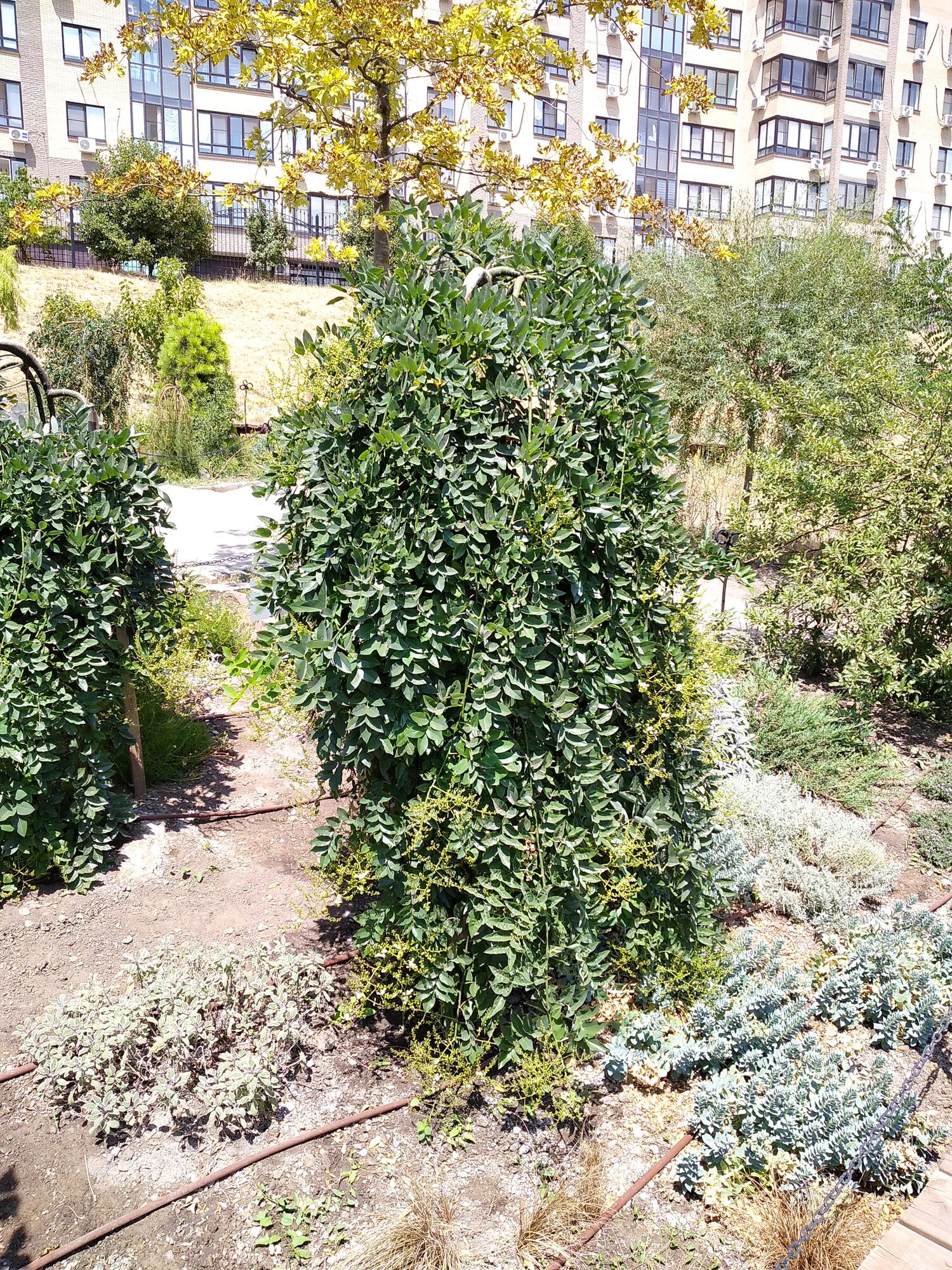 Описание: Листопадное дерево с широкой кроной, высотой 25 м. Кора на старых стволах тёмно-серая с трещинами. Молодые ветви зелёные, без колючек. Цветы белые или желтоватые, ароматные, собраны в крупные рыхлые метёлки до 50 см длиной. Один из самых лучших медоносов. Цветет в течение 1,5 месяцев в июле – августе, сразу после липы, что для пчеловодства крайне важно. После цветения на кончиках ветвей появляются семенные коробочки. Стручки отличаются необычностью и привлекательностью, достигая 20 см в длину. Внешне напоминают нитки бусин. Поздней осенью ими лакомятся перелетающие на юг через Ростов свиристели. Бутоны и незрелые плоды софоры собирают для лечения сердечно-сосудистой системы и авитаминозов, наружно ее применяют как ранозаживляющее средство, при ожогах, язвах и других кожных поражениях.