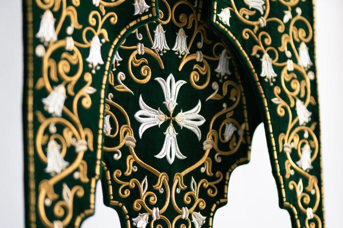 Святитель Павлин считается покровителем звонарей и вся концепция хоругви была построена исходя из этого. У настоятеля прихода протоиерея Валерия Волощука родилась необычная идея сделать хоругвь двойной и сделать ее лепестки такой формы, чтоб они образовывали очертания колоколов. И эта идея очень удачно воплощена в жизнь. Орнамент вокруг иконы и на лепестках составляют переплетенные между собой цветы - колокольчики, которые по преданию и увидел во сне святитель, озаботившись тем, как же созывать людей на богослужение. И именно они послужили прототипом для создания колоколов. На реверсе вышит 150 псалом, который является как бы смысловым завершением двух предыдущих 148 и 149. Все три песнопения вместе называются "хвалительными", т.е. восхваляющими Бога.