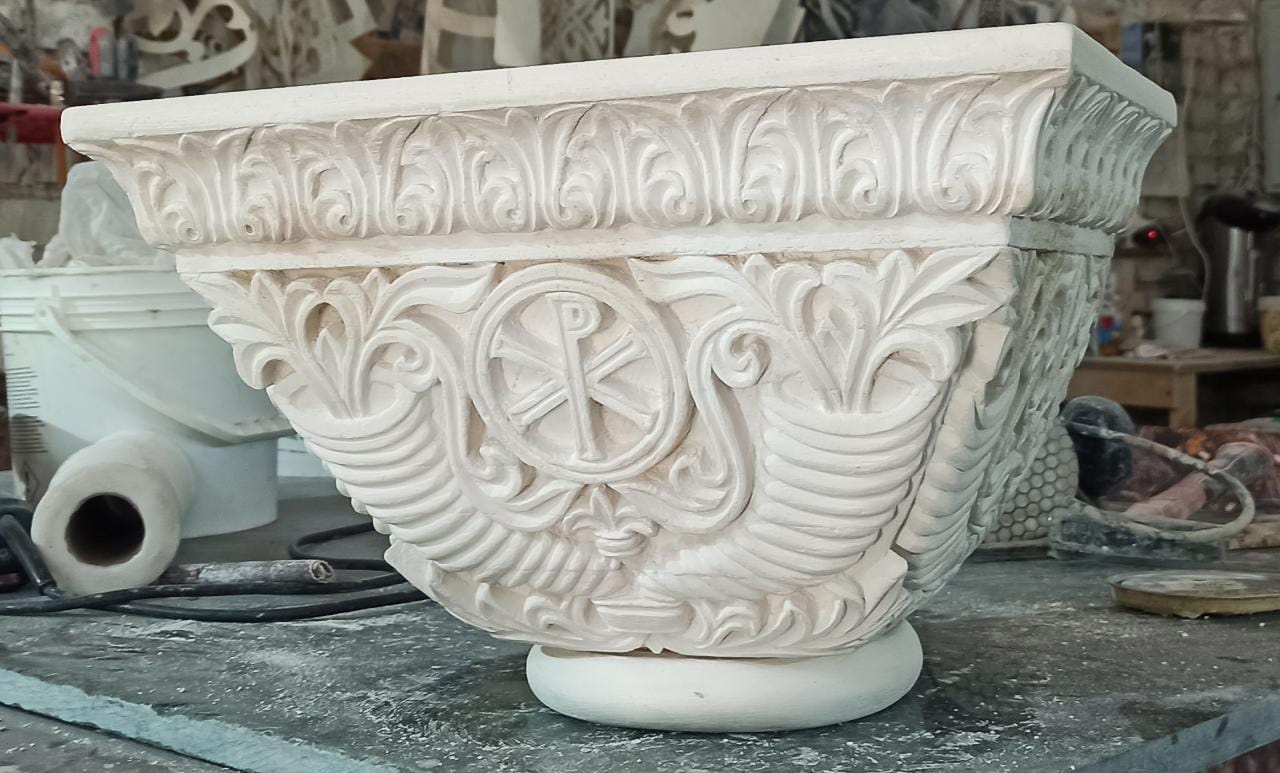Изготовлена пробная капитель для тела иконостаса храма святого Георгия Победоносца. Перед тем, как элементы иконостаса будут вырезаться из камня, делают пробную резьбу в гипсе. Это необходимо для того, чтобы понять объем, оценить резьбу и внести соответствующие правки. За образец взята капитель Церкви Богородицы Паммакаристы – самого значительного памятника византийского искусства, сохранившийся в Стамбуле.