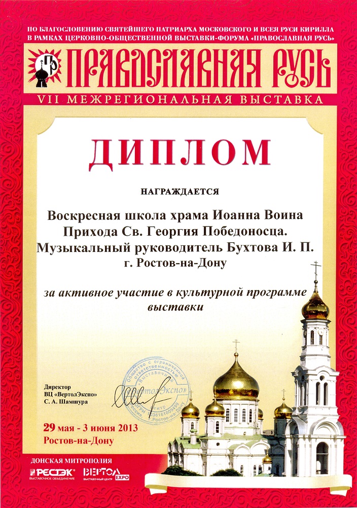 1 июня 2013 года в рамках VII выставки-ярмарки "Православная Русь" в выставочном центре "ВертолЭкспо" состоялся концерт воспитанников Воскресной школы прихода святого Георгия Победоносца. Дети совместно с музыкальным руководителем Ириной Петровной Бухтовой подготовили для гостей выставки пасхальные стихиры, а также всеми любимые военные песни "Три танкиста", "Журавли", "Хотят ли русские войны" и другие. Прозвучали также патриотические песни, сочиненные Виктором Ивановичем Чуцковым, которые уже стали творческой визитной карточкой нашего прихода. Между песнями ученики школы читали стихи, посвященные Великой войне и празднику Светлой Пасхи Христовой. Солистка ансамбля воскресной школы Маша Ставицкая исполнила народную песню о балалайке, в это время девочки под бурные аплодисменты публики танцевали вместе с ростовыми куклами, изготовленными в приходском кукольном кружке под руководством Валентины Антоновны Шабеко. Отлично справилась с ролью ведущей мероприятия ученица Настя Соколова: своим звонким голосом она пробуждала радостное праздничное настроение у гостей вечера. Программу концерта дети завершили исполнением самой известной песни В.И.Чуцкова - "Россия вперед!".