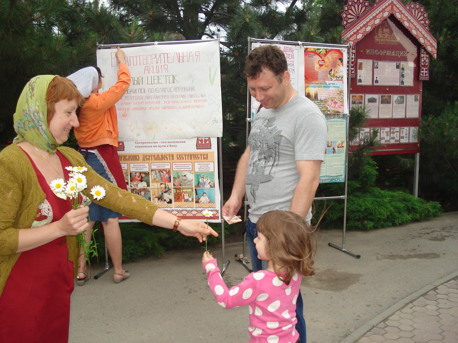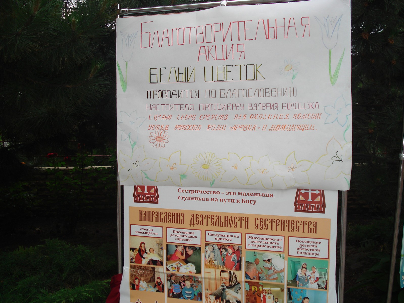 В этот же день по благословению настоятеля прихода отца Валерия Волощука прошла благотворительная акция "Белый цветок" с целью сбора средств для оказания помощи детскому дому Аревик. Люди были рады помочь, искренне переживали за судьбу детей, оставшихся без семьи. Собранные средства пойдут на ремонт детской площадки, а также на покупку развивающих игр и материалов для детей. Подробнее о благоустройстве детского дома можно будет узнать из будущих новостей нашего сайта. Благодарим всех, кто принял участие. Храни вас всех Господь! Слава Богу за всё!