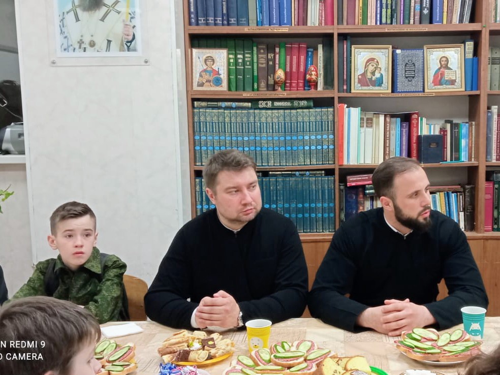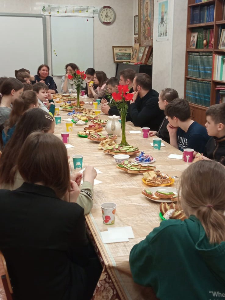 В воскресенье праздник продолжился в старших группах. В гости к ребятам пришли протодиакон нашего храма отец Александр Смагло и алтарник Евгений Завгородний. Отец Александр начал разговор с детьми с истории исхода израильского народа из Египта, объяснил детям суть ветхозаветной Пасхи. А потом буквально посыпались вопросы от ребят дорогим гостям. Причём вопросы были очень серьёзные, касающиеся догматического богословия, второго пришествия Христа, последствий грехопадения, свойств Бога, а также практических вопросов литургики и истории Церкви. Встреча пролетела незаметно, и никто не хотел расходиться.