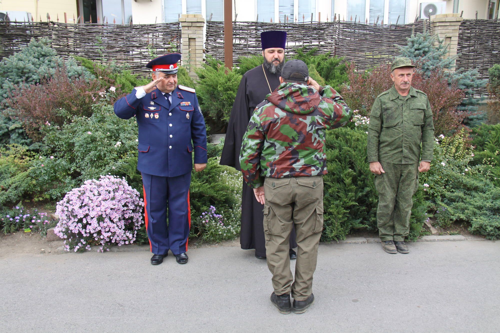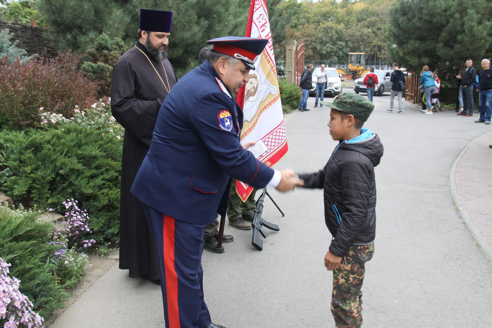 Ко всем собравшимся с отеческим духовным напутствием обратился настоятель прихода протоиерей Валерий Волощук. Он призвал учащихся, преподавателей и родителей брать пример в служении Отечеству со святых воинов земли Русской, великих полководцев таких, как адмирал святой воин Федор Федорович Ушаков, который в тяжелые для России времена, обращаясь к своим морякам, говорил «Не отчаивайтесь, сии грозные бури обратятся во славу России». Батюшка также напомнил всем, что три храма нашего прихода находятся под покровительством святых воинов: Георгия Победоносца, Иоанна Воина, сорока Севастийских мучеников, а четвертый — Воскресенский войсковой собор долгое время был главным храмом Донских казаков.