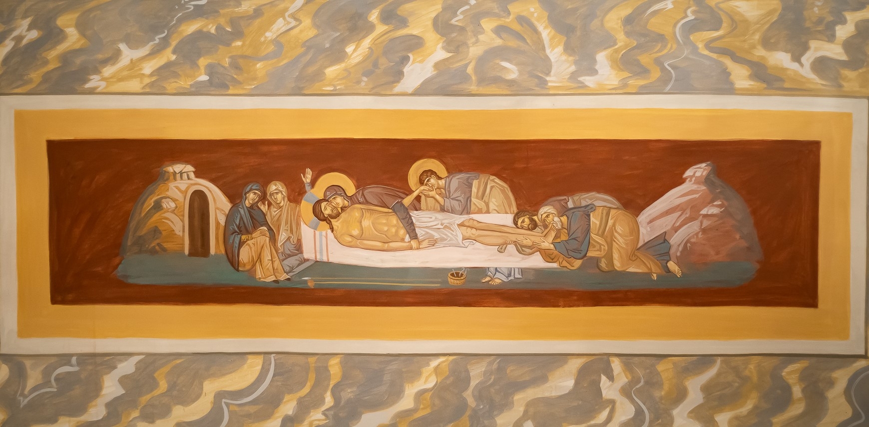 Этот евангельский сюжет лёг в основу иконы «Положение во Гроб». Она рассказывает о событиях Страстной пятницы: снятии Спасителя со Креста, оплакивании и Его погребении. В наших храмах такие образы можно увидеть над жертвенником в храме святого Георгия Победоносца и криптовом храме Сорока мучеников Севастийских. А также — в росписи Филиппова придела.