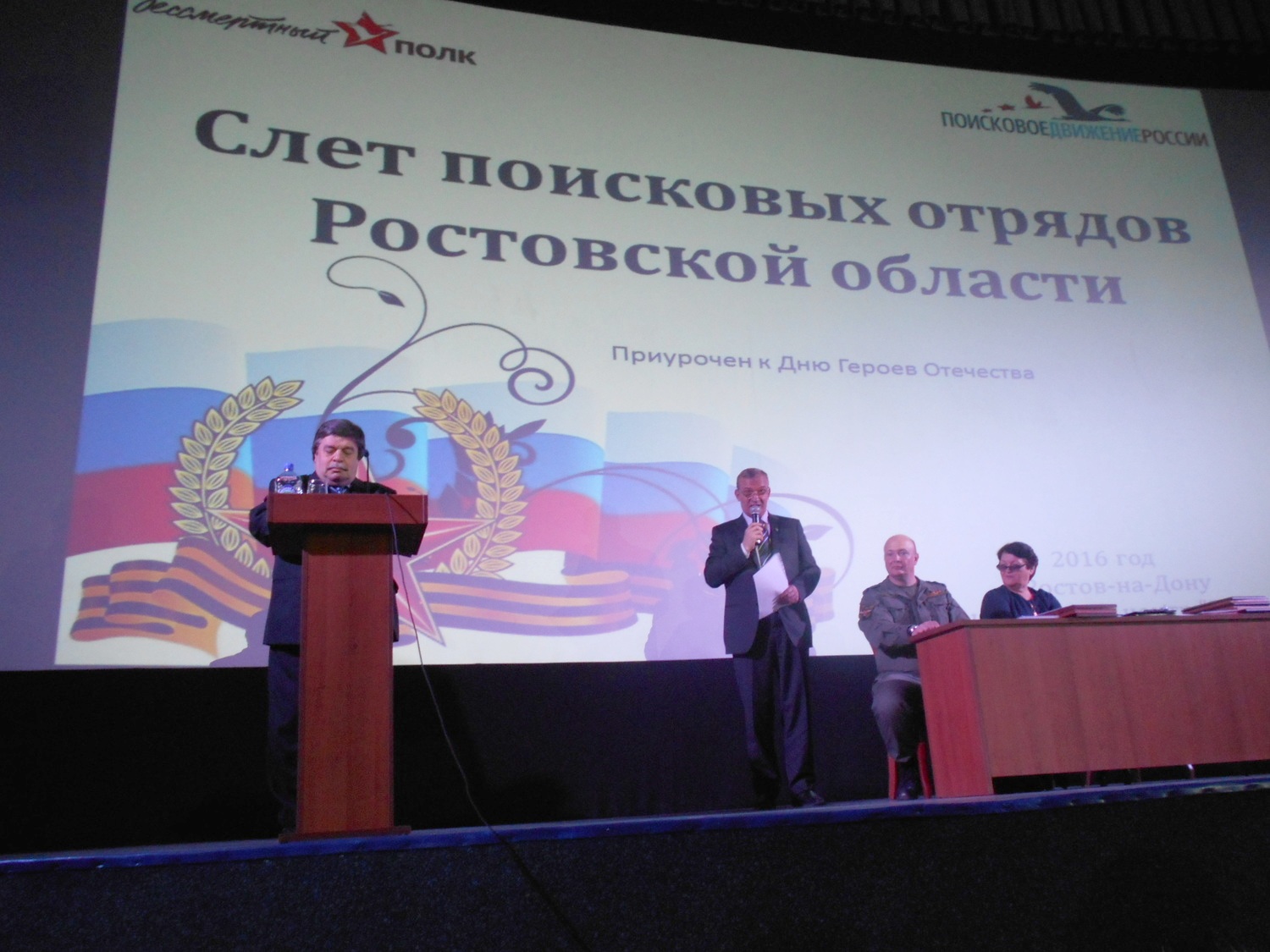 10 декабря 2016 года в здании Ростовского городского патриотического центра Победа прошел слет поисковых отрядов Ростовской области. Организаторы слета: Ростовское отделение поискового движения России (руководитель Щербанов Владимир Кириллович), Общественное патриотическое движение Ростовской области «Бессметный полк», Поисковое объединение «Миус Фронт»( руководитель Кудряков Андрей Юрьевич). На мероприятии присутствовали представители Правительства Ростовской области, депутаты Законодательного собрания, сотрудники областного военного комиссариата, поисковики из различных уголков Ростовской области. Основными задачами слета было налаживание работы по объединению усилий государственных и общественных учреждений и организаций в деле увековечивания памяти погибших защитников Отечества. Представители Ростовского духовно-патриотического центра Святого Георгия Победоносца приняли активное участие в работе слета.