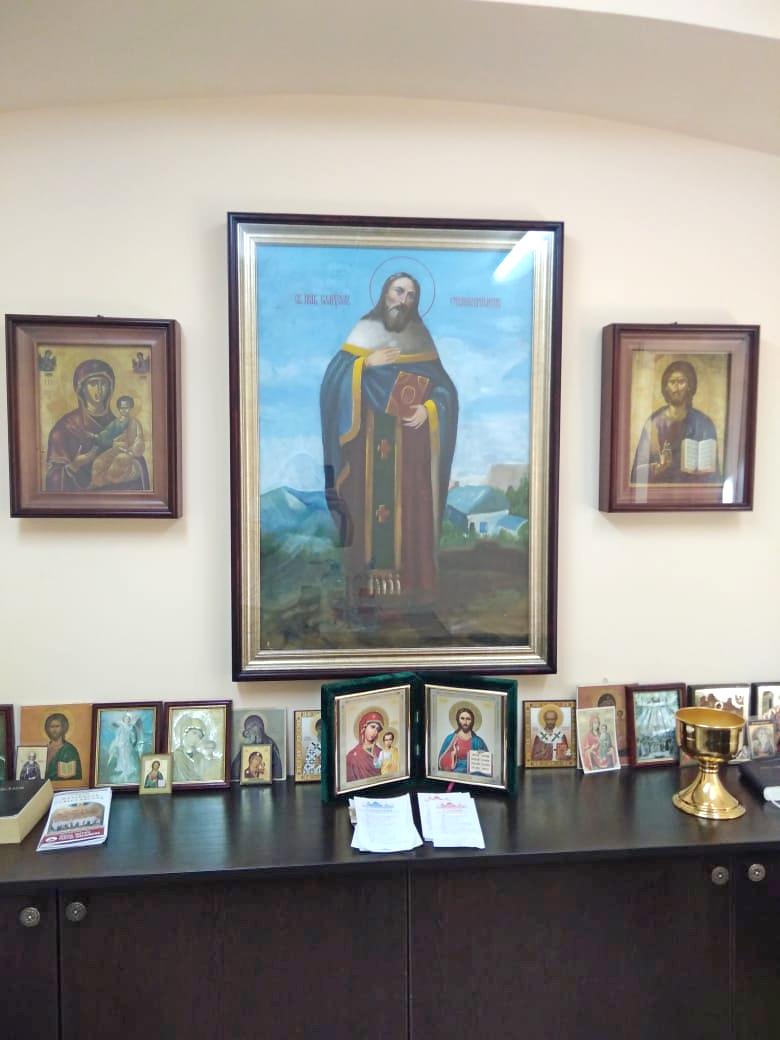 А для нашего прихода сегодняшняя дата – это еще один небольшой престольный день. В 2016 году администрация Центра социального обслуживания населения Советского района обратилась с просьбой о создании молитвенной комнаты. В иконописной мастерской был сделан проект комнаты, заказаны витражи на дверь и окно, изготовлена необходимая мебель: стеллажи для памяток и церковной литературы. Святым покровителем был выбран один из бессребреников и целителей – святой Сампсон Странноприимец. Примечательно, что икона святого, которая находится сейчас в молитвенной комнате, была написана нашим настоятелем в возрасте 14 лет. При подготовке к освящению молитвенной комнаты иконописцы дописали нимб и сделали надписания.