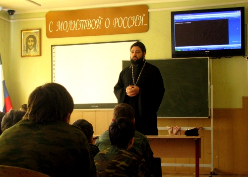 10 марта 2011 г. по приглашению директора казачьей гимназии имени Я. П. Бакланова Полуян Людмилы Ивановны настоятель прихода святого Георгия Победоносца протоиерей Валерий Волощук и председатель Духовно-патриотического центра при приходе Чуцков Виктор Иванович провели встречу духовно-нравственной патриотической тематики с учащимися гимназии.