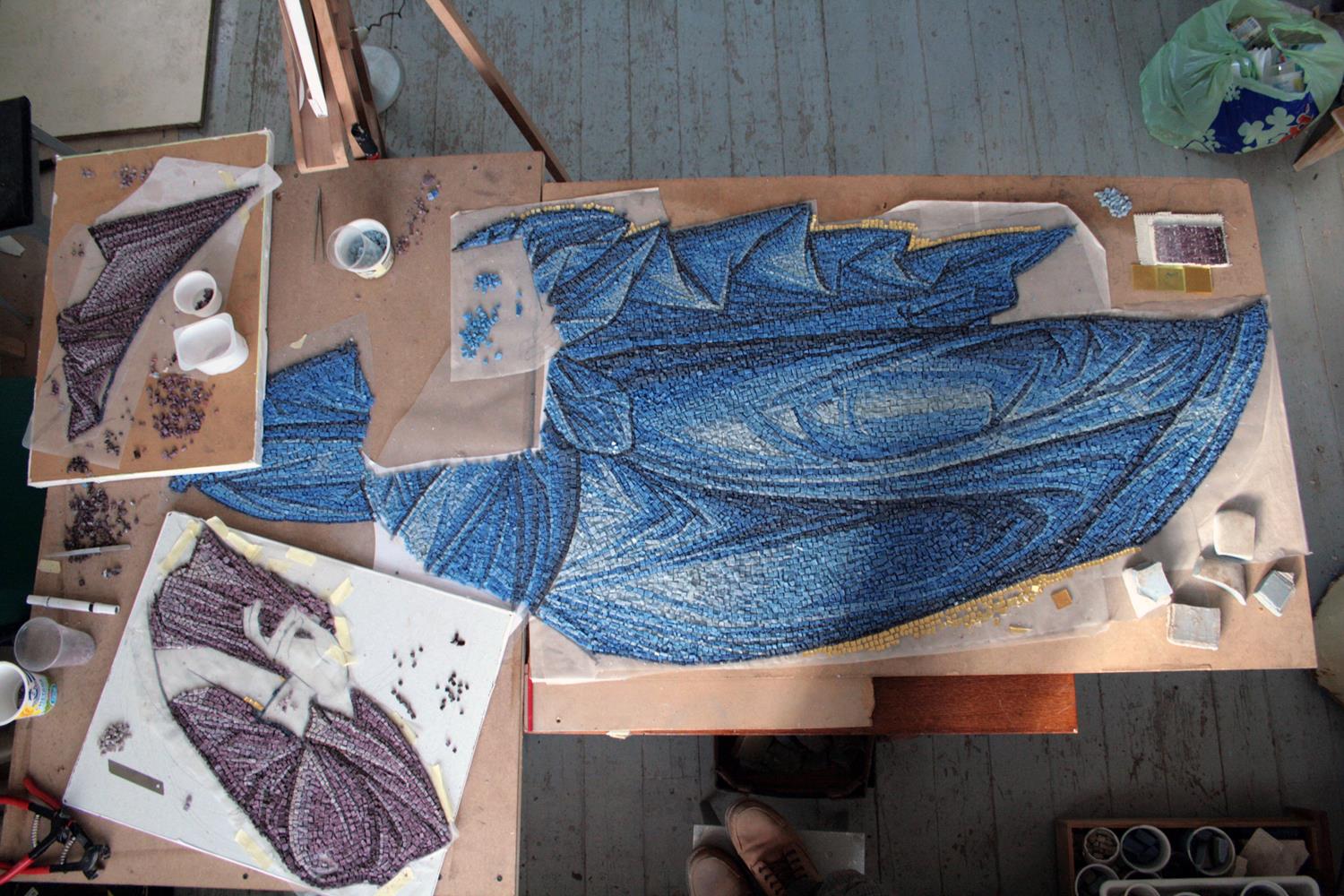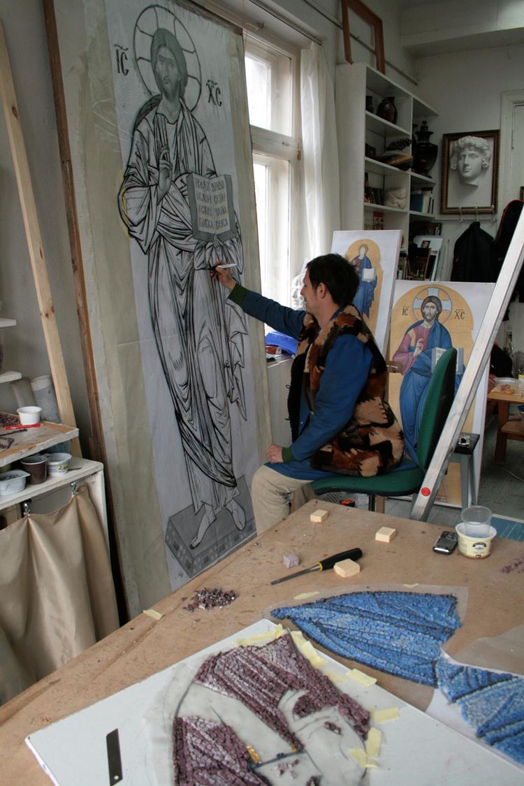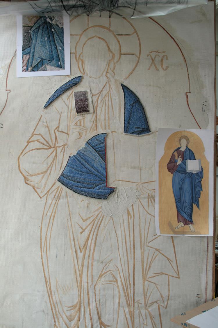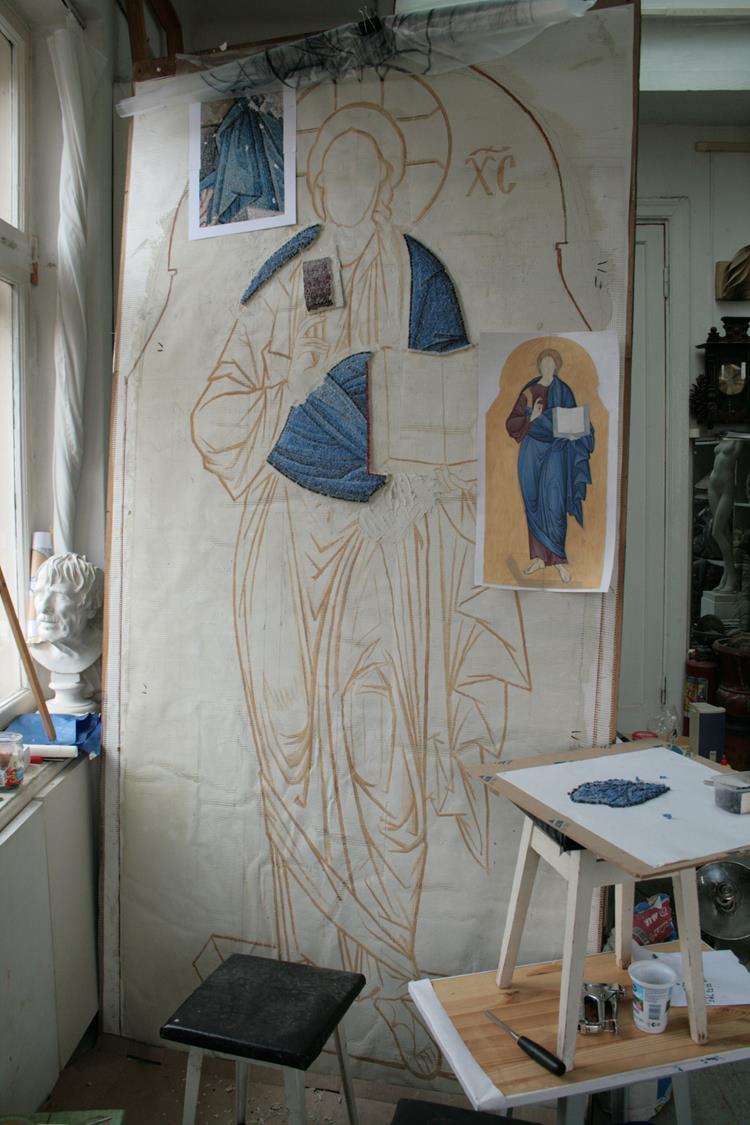 Кроме того начались работы по набору иконостаса в верхний предел. Напомним, что иконостас алтаря в честь Святого Великомученика Георгия Победоносца будет выполнен в мозаичной технике.