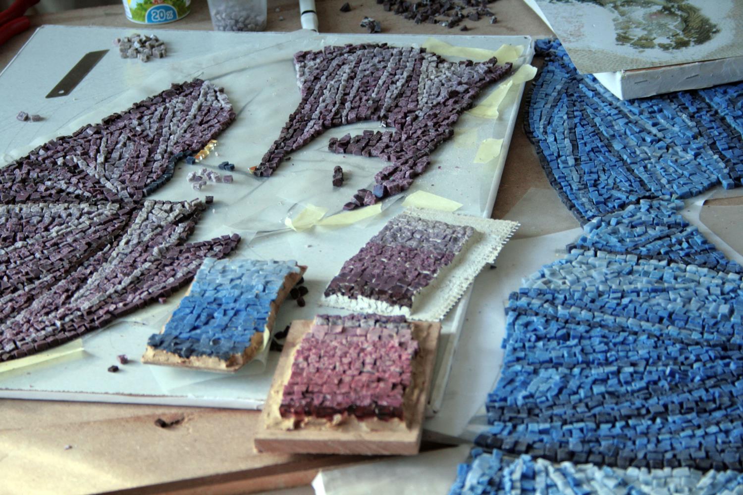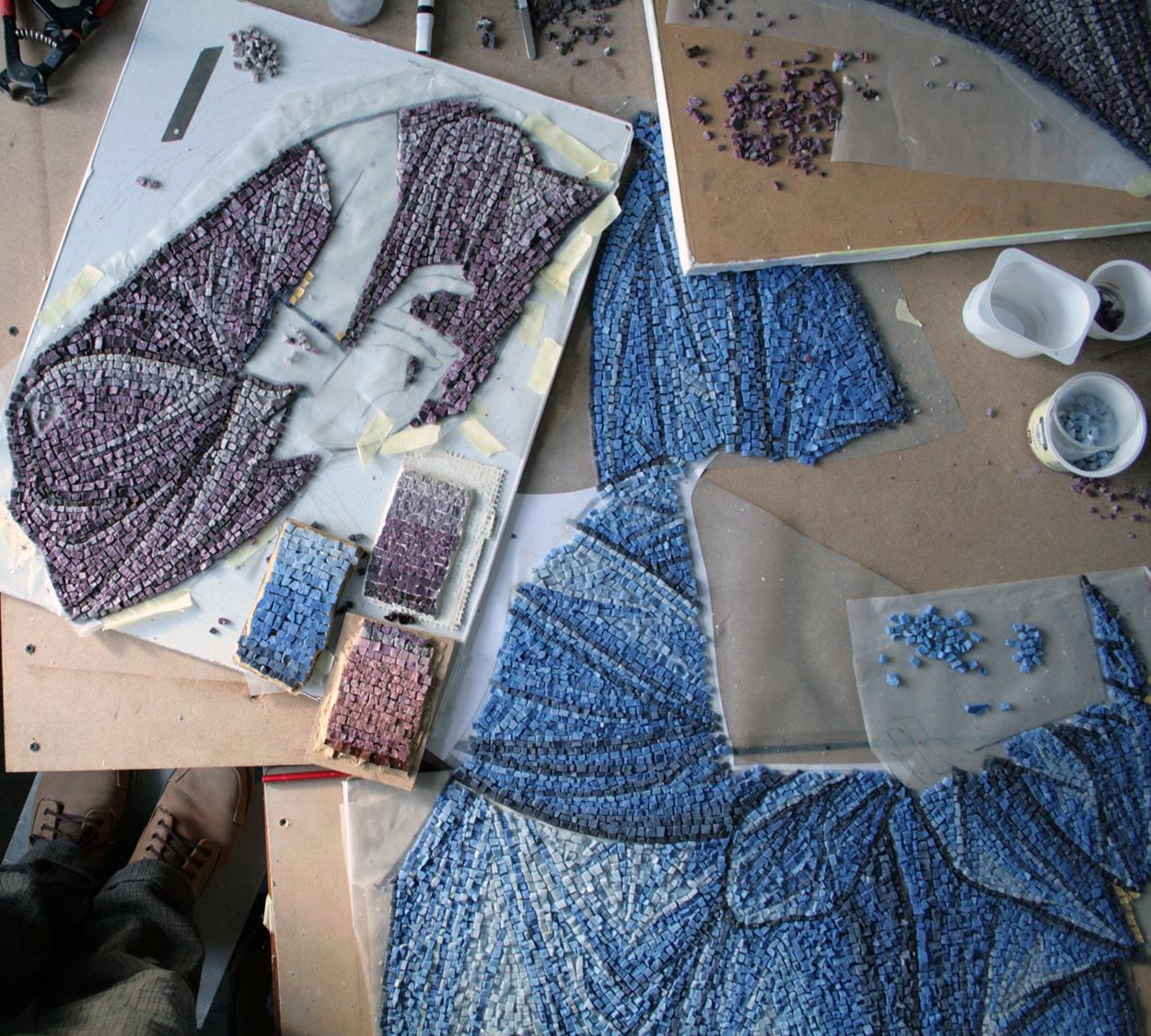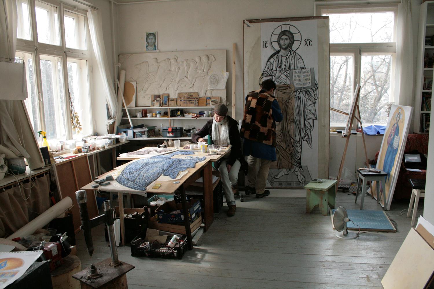 Кроме того начались работы по набору иконостаса в верхний предел. Напомним, что иконостас алтаря в честь Святого Великомученика Георгия Победоносца будет выполнен в мозаичной технике.
