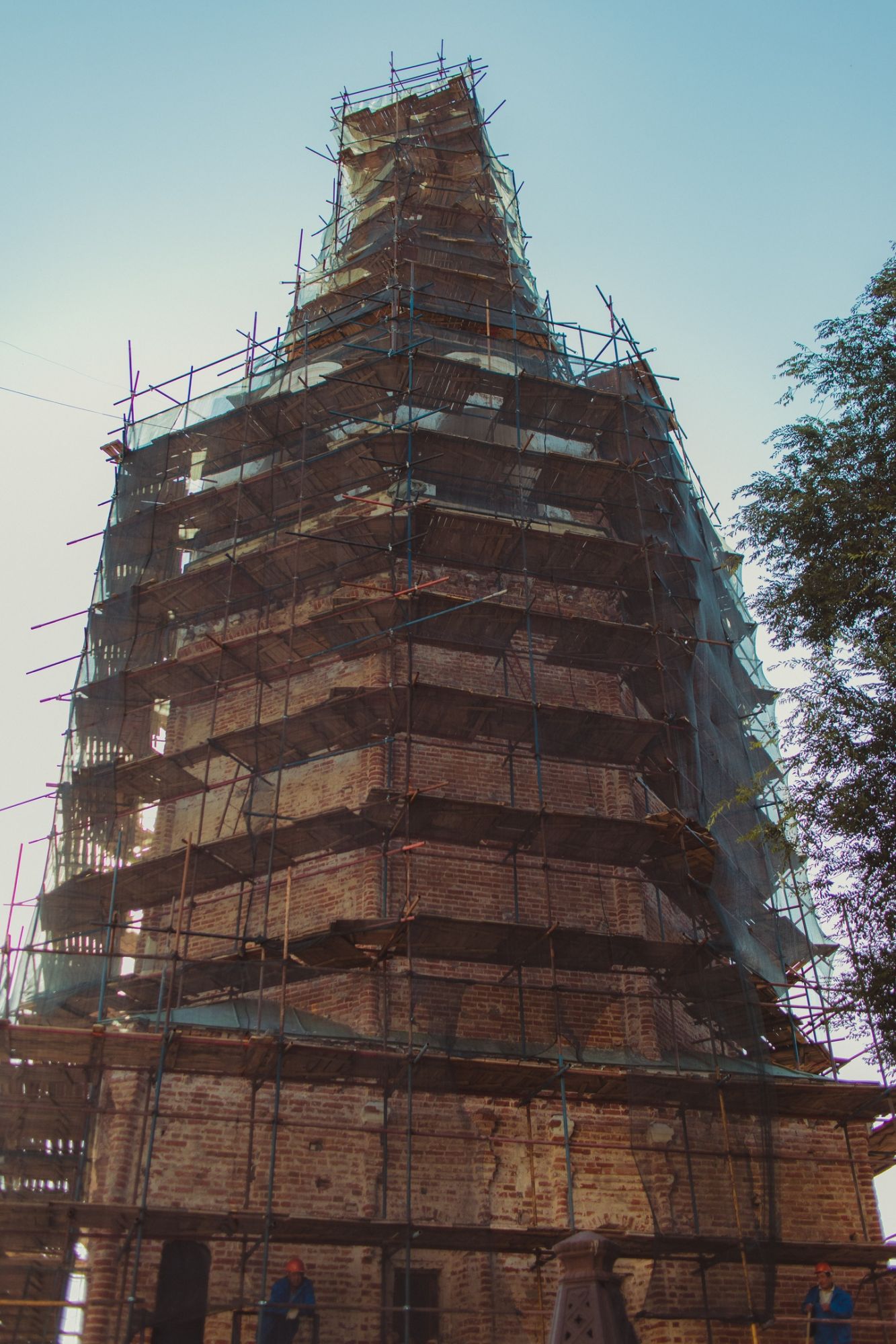 Для того, чтобы понять масштаб работ, достаточно взглянуть на фотографии, работа идет полным ходом, сняты все наслоения до родного кирпича, производится вычинка утраченных мест и восстанавливается историческая каменная кладка. Большое количество нового кирпича, изготовленного под старинный формат, обтачивается по чертежам проекта реставрации для сохранения стилистики и архитектурных особенностей памятника федерального значения. Реставрация колокольни началась в середине лета и по планам должна завершиться до конца этого года.