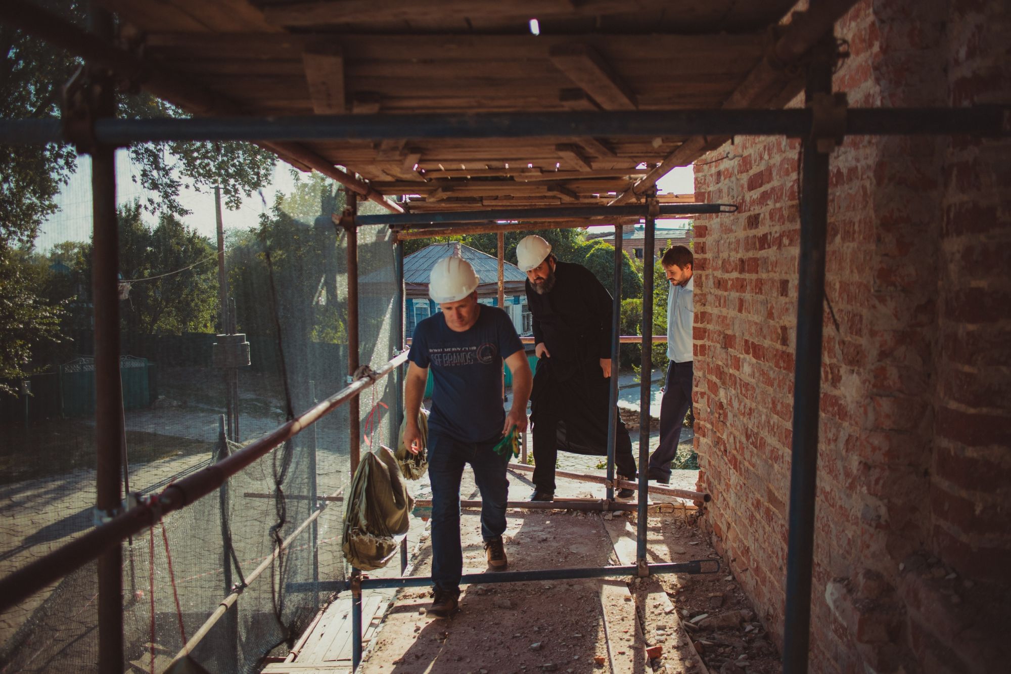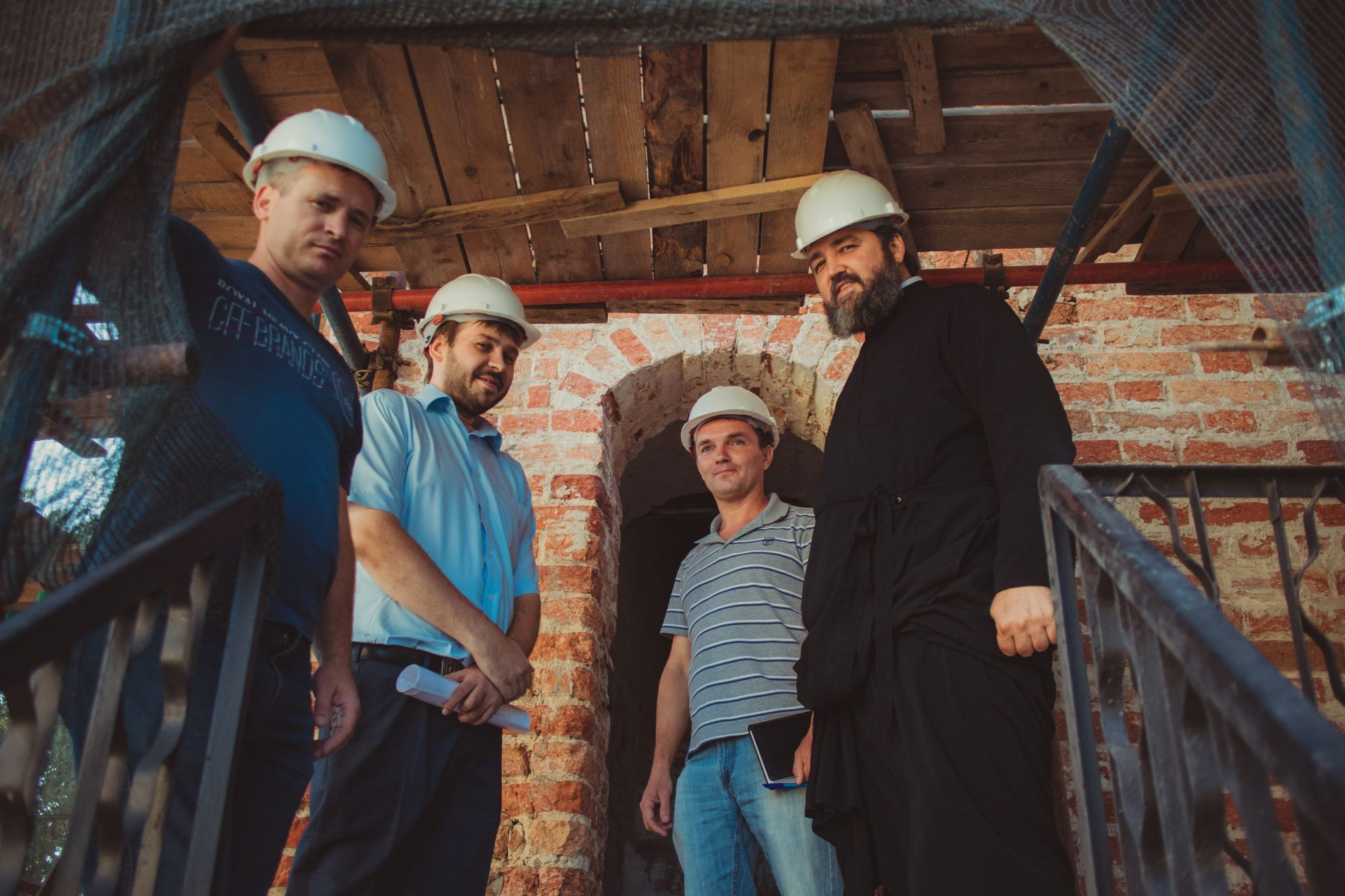 Настоятель собора убедился, что работы проводятся максимально бережно по отношению ко всем исторически значимым элементам колокольни.