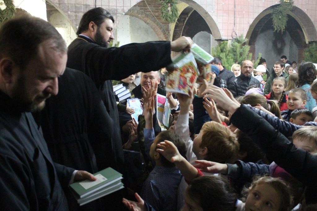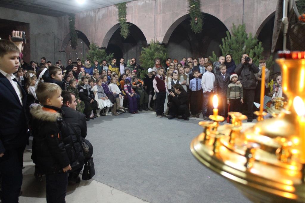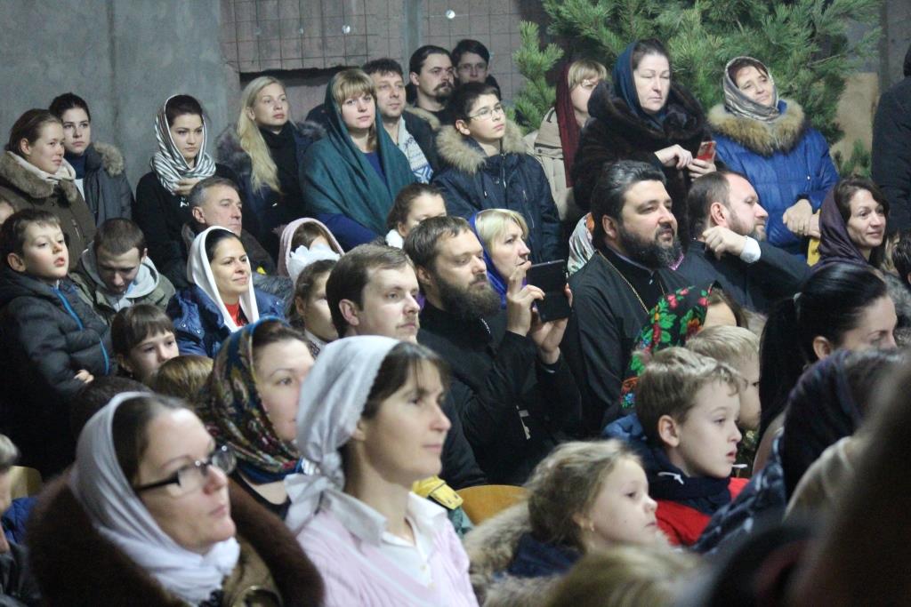 Нижний строящийся храм в честь Сорока Севастийских мучеников едва смог вместить всех гостей. Открывая праздник, настоятель прихода протоиерей Валерий Волощук поздравил воспитанников, их родителей и преподавателей школы со светлым праздником Рождества Христова.