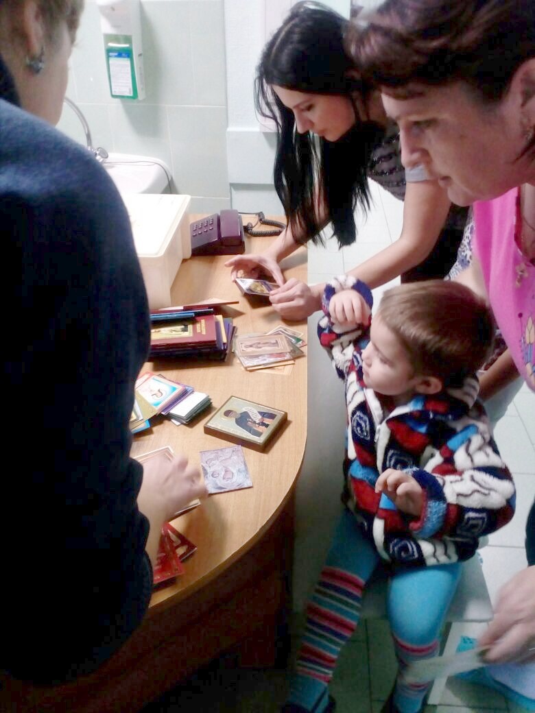 Мы, по традиции, общались с людьми, раздавали иконочки, крестики, святое маслице, записывали деток на Крещение, Причастие, вносили имена родных и близких в записочки о здравии.