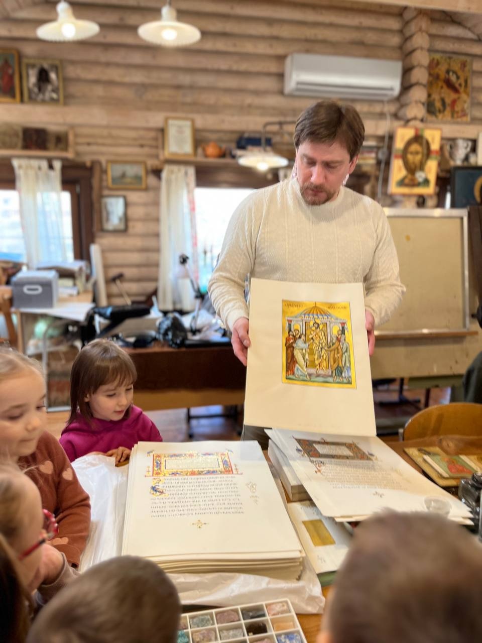 Дмитрий Шестопалов рассказал малышам о работе мастериц-золотошвеек и художников- иконописцев. Особенно детей увлёк его рассказ о материалах для написания икон и их подготовке к работе. Они с удовольствием подержали в руках разноцветные камушки, заинтересовались кусочками мозаичного стекла. Родители тоже активно задавали интересные вопросы и отметили, что некоторые факты из уст Дмитрия услышали впервые.