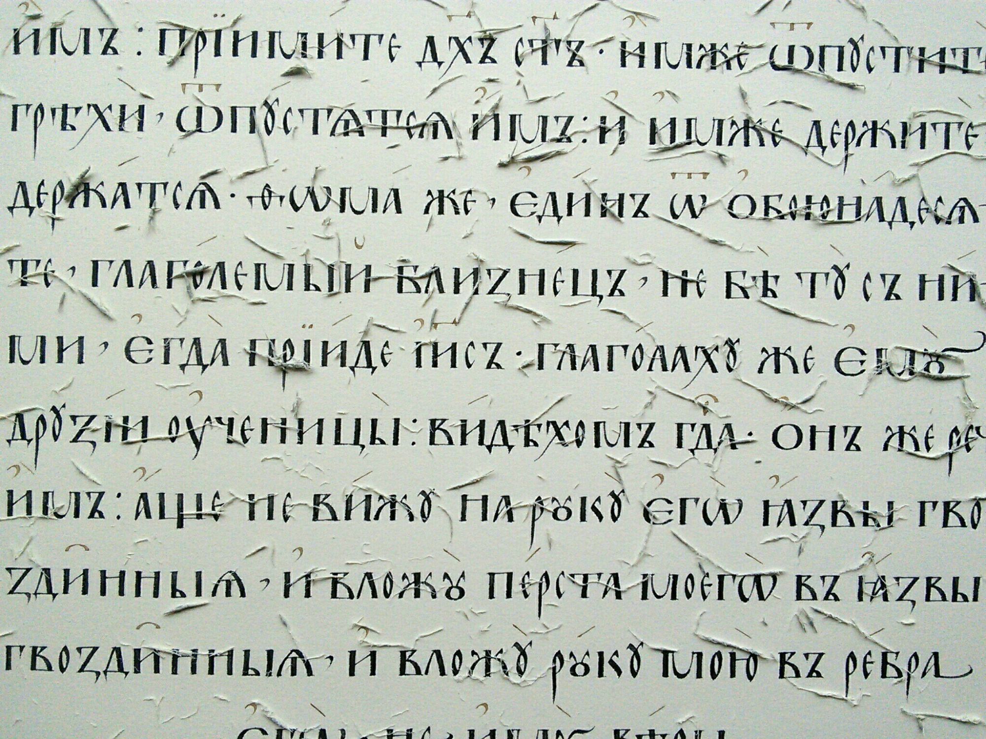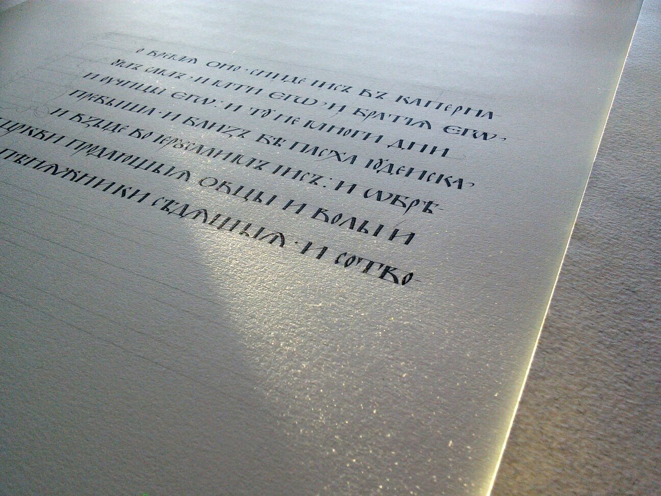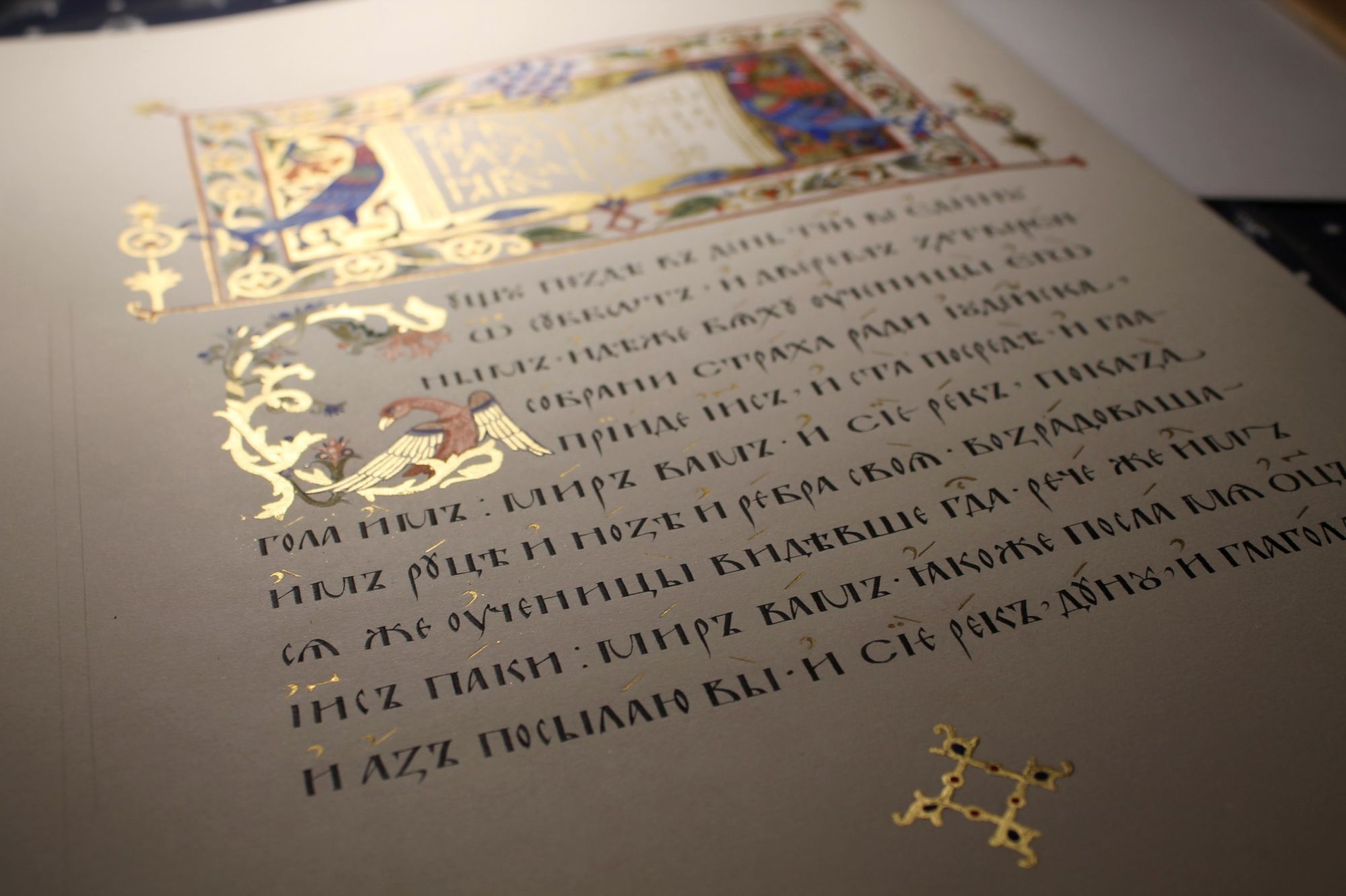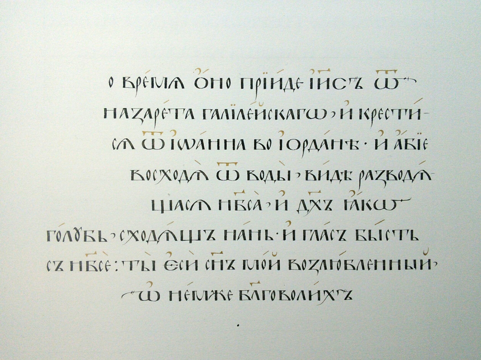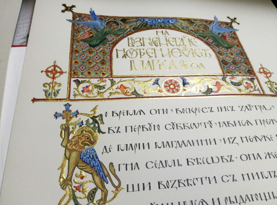 11 октября 2018 года протоиерей Валерий Волощук встретился с преподавателем школы каллиграфии Ольгой Варламовой, одной из участниц уникального проекта по созданию рукописного Евангелия апракос для храма 40 Севастийских мучеников! Ольга пишет текст, Наталья Ким работает над декором. На фотографиях страницы Евангелия на разных этапах прорисовки, бумага Saunders Waterford HP, тарелочка творёного золота.