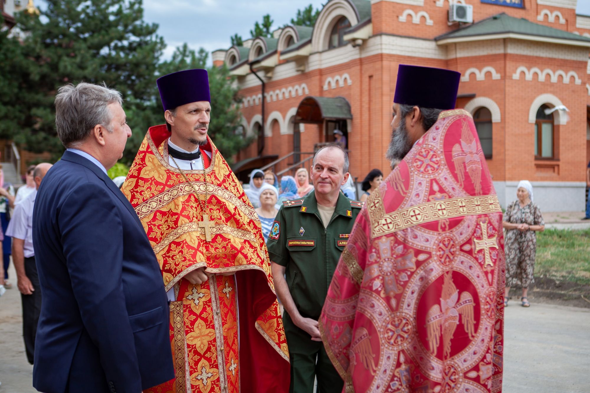 В своей проповеди Его Преосвященство отметил «мудрость военных, занимающихся созиданием. Всякий человек, который участвует в созидании как мира окружающего, так и мира внутреннего, духовного, является соработником Господа. В том, что сегодня этот храм становится местом притяжения не только для горожан, но и для военнослужащих, есть великий промысел Божий. Я достаточно часто посещаю это место и вижу, как над его строительством трудится и община, и личный состав Южного военного округа, какое внимание этому делу оказывает командование. И это не может не радовать, потому что в данном конкретном деле соединились две силы, два вектора: вектор Русской Церкви и вектор Вооруженных Сил. Эти две силы, как два крыла для нашего Отечества, несут его, не дают ему упасть и разбиться, охраняют его от врагов видимых и невидимых».
