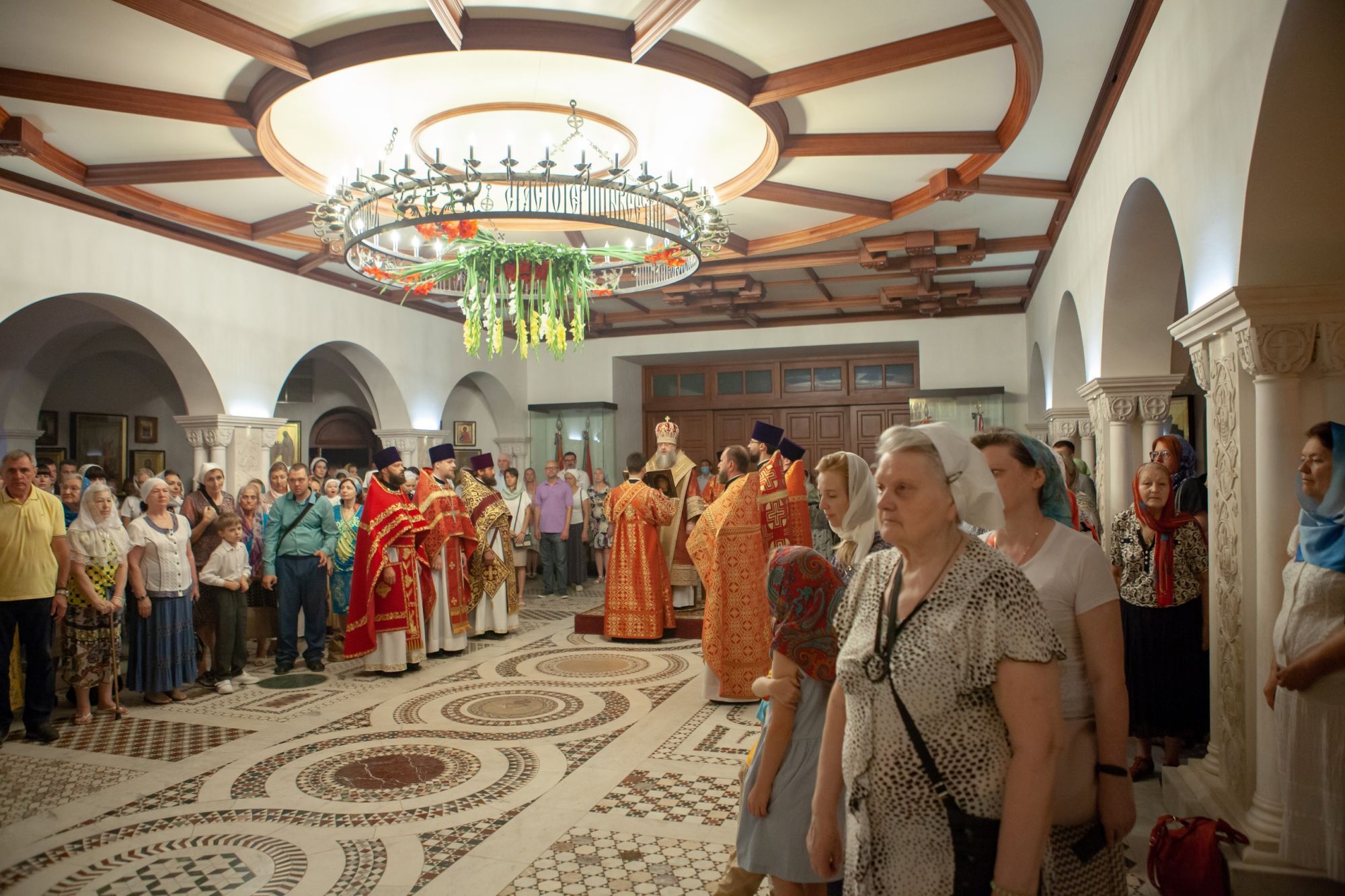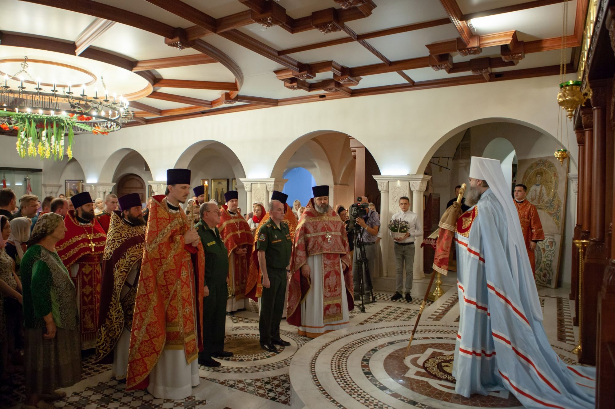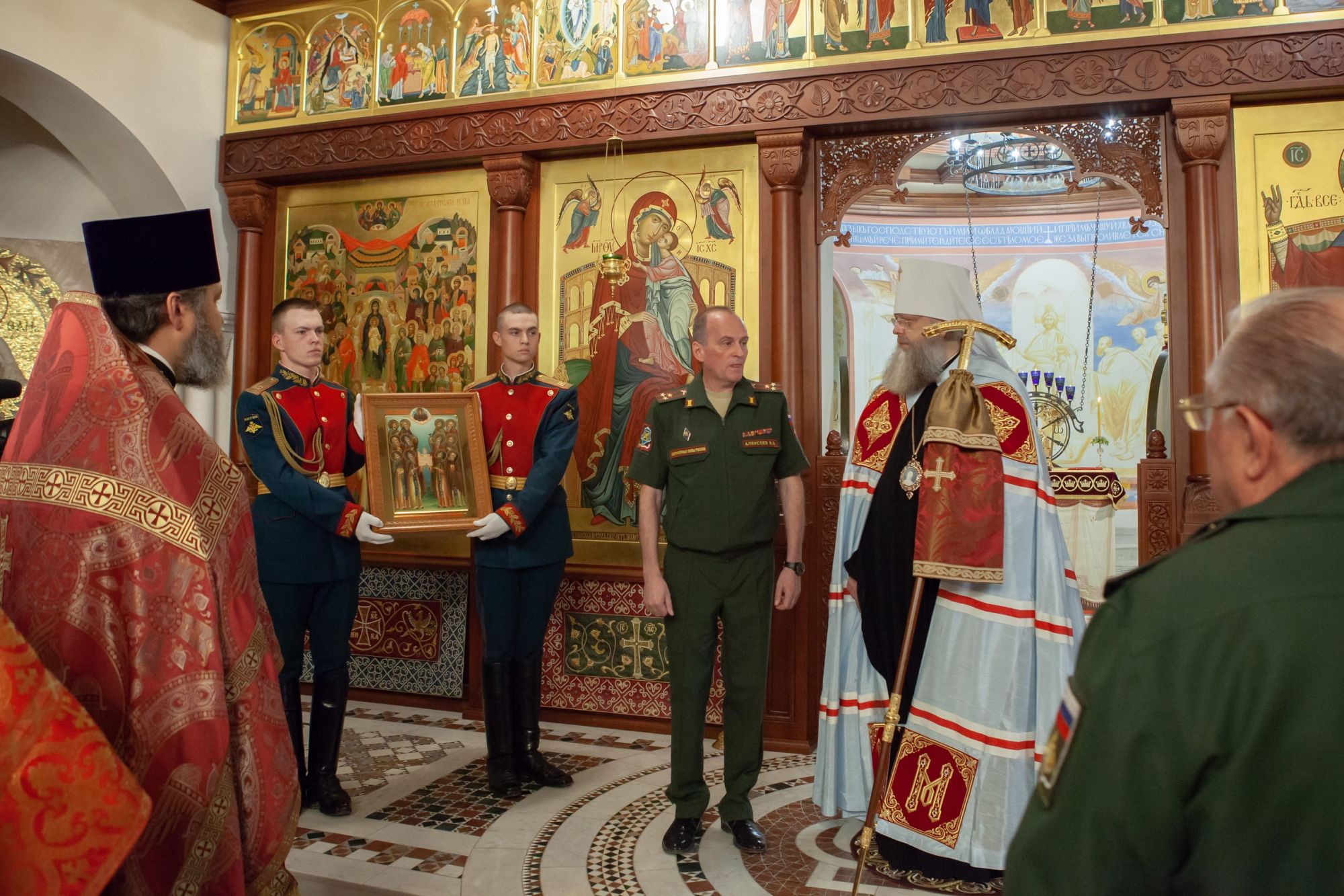 По окончании богослужения настоятель прихода протоиерей Валерий Волощук сыновне поблагодарил правящего архиерея за многолетнее попечение и совместную молитву в день престольного праздника храма в честь мученика Иоанна Воина, расположенного на территории прихода. После приветственных слов настоятеля храма от лица командования Южного военного округа заместитель командующего ЮВО по строительству Владимир Васильевич Алексеев передал в дар храму образ 12-ти греков, строителей соборной Успенской церкви Киево-Печерской Лавры. Глава Донской митрополии, в свою очередь, передал в главный храм Южного военного округа святого Георгия Победоносца города Ростова-на-Дону для молитвенного поклонения Августовскую икону «Явление Богоматери русскому воинству в 1917г.»