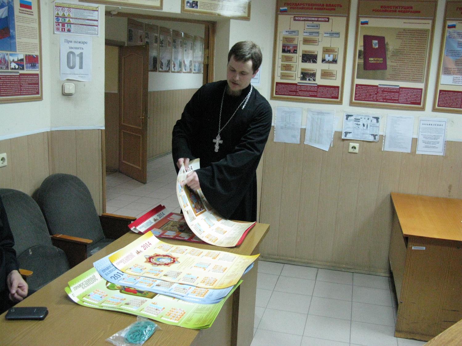 Батюшка передал отделу выпущенные приходом православные настенные календари с изображением икон, написанных и вышитых мастерами приходского ремесленнического центра.