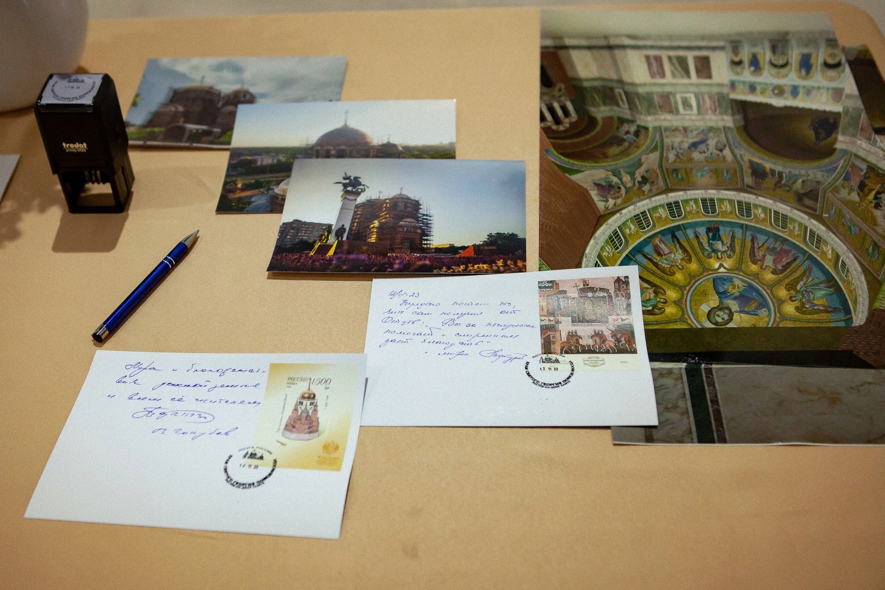 В ходе визита Глава Донской митрополии и руководитель области приняли участие в церемонии гашения художественной почтовой марки особым памятным штемпелем с изображением храма.