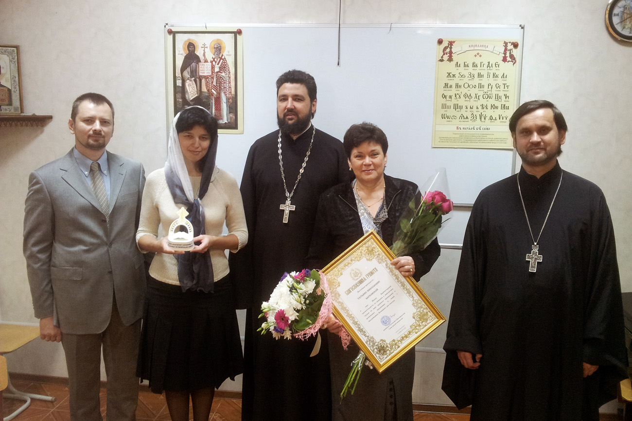 В ходе посещения прихода отец Андрей и настоятель прихода святого Георгия Победоносца протоиерей Валерий Волощук поздравили начальника МУ «Отдела образования Советского района города Ростова-на-Дону» Татьяну Николаевну Барковскую с Днем Учителя. Протоиерей Андрей Мекушкин вручил Татьяне Николаевне Благословенную митрополичью грамоту «За успехи в духовно-нравственном воспитании учащихся» со словами благодарности за взаимодействие на ниве образования и содействие с Ростовской епархией.
