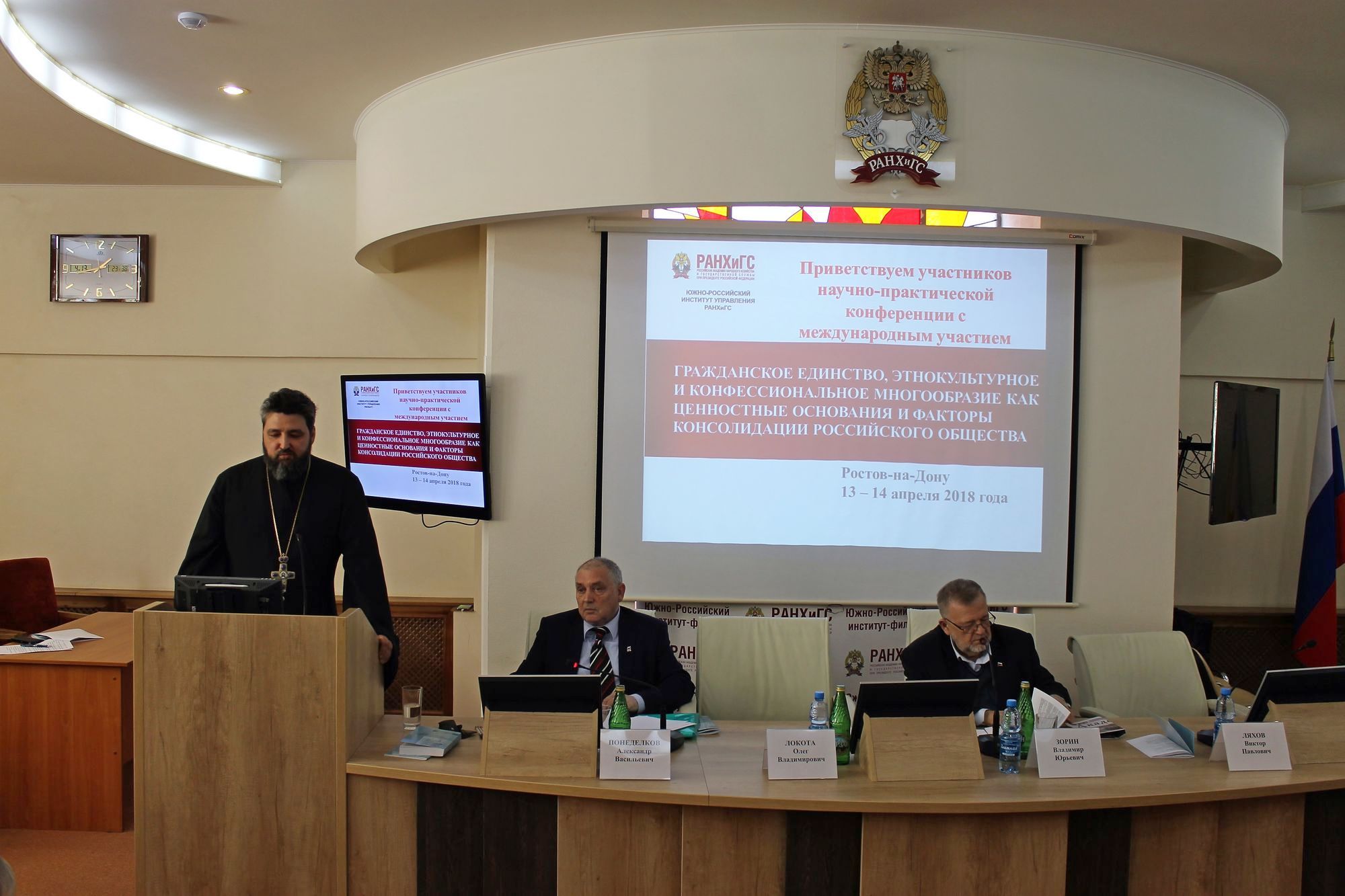 13 апреля 2018 года руководитель отдела по взаимоотношениям Церкви и общества Ростовской-на-Дону епархии протоиерей Валерий Волощук принял участие с докладом «Роль православной Церкви в цивилизационном развитии России: история и современность» в научно-практической конференции с международным участием «Гражданское единство, этнокультурное и конфессиональное многообразие как ценностные основания и фактор консолидации российского общества», которая прошла в Южно-Российском институте управления – филиале Российской академии народного хозяйства и государственной службы при Президенте РФ.
