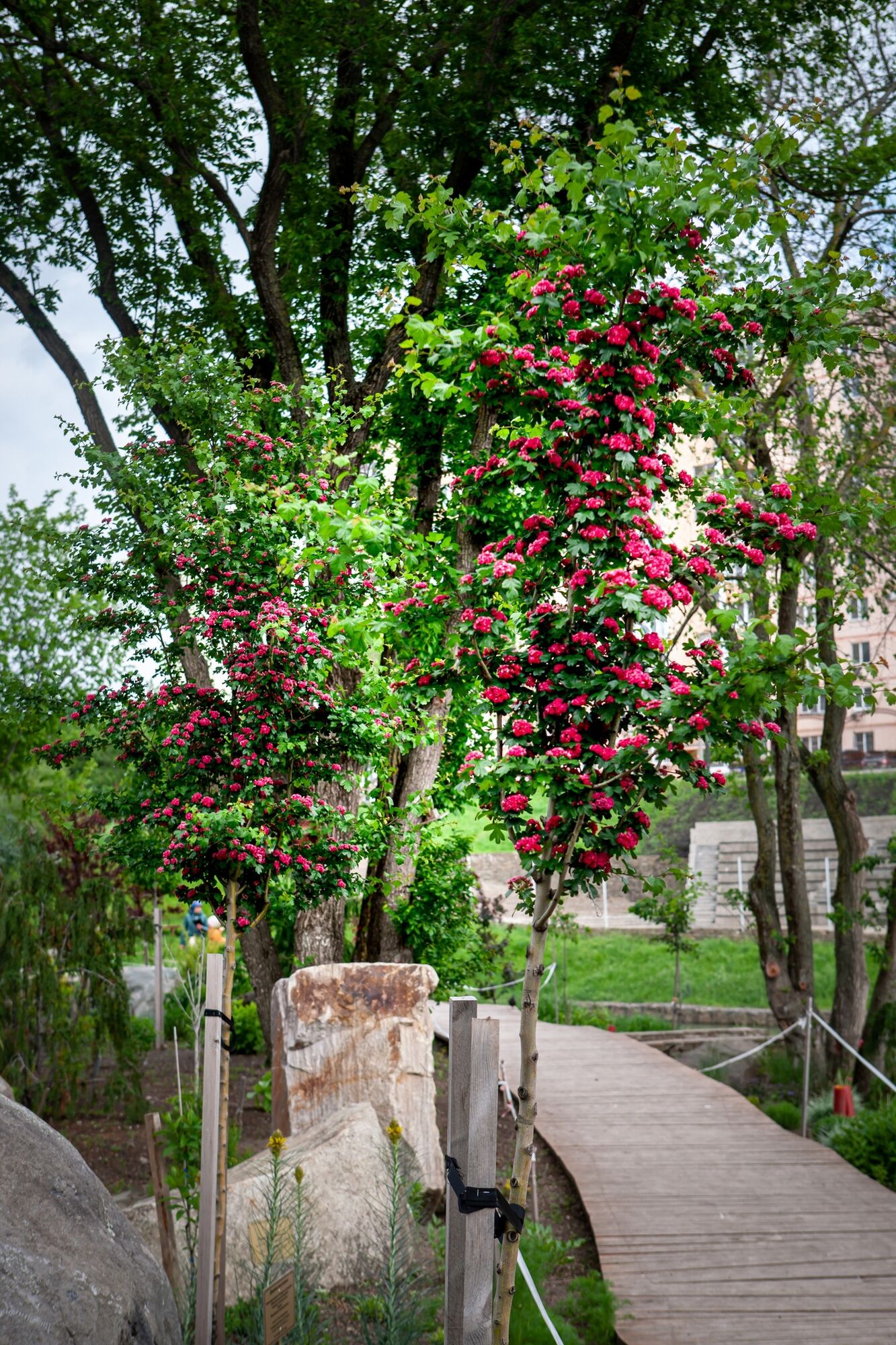 Боярышник Пауль Скарлет или "Барыня-дерево" весной покрыт нежно-розовыми благоухающими цветами. Пышность цветения напоминает цветение сакуры, живет до 400 лет. По осени усыпан глянцевыми сочными красными ягодами.