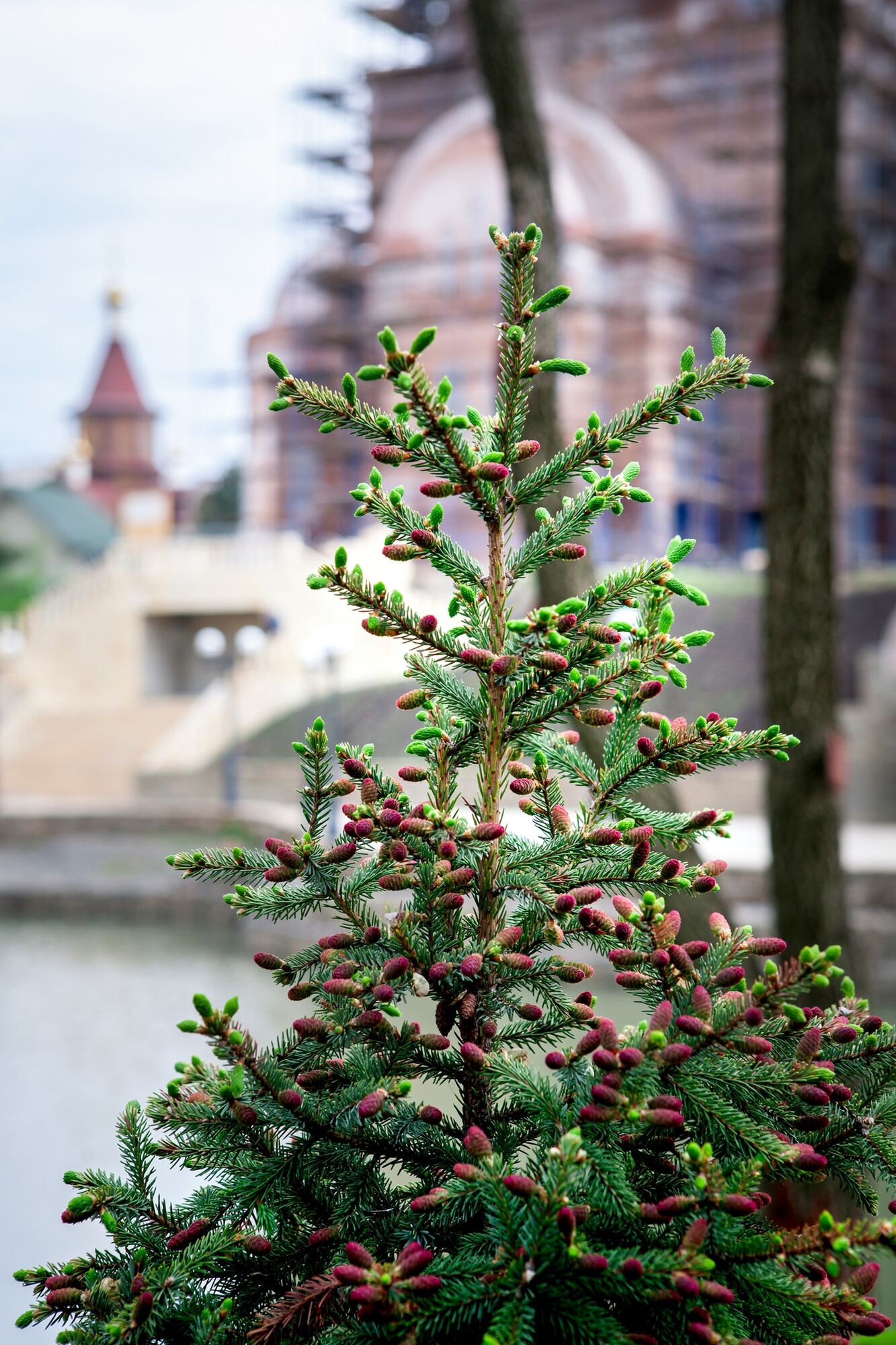 Ель обыкновенная. Хотя ели и не цветут, в период опыления они становятся такими же декоративными, как и цветковые культуры. Весной на них формируются женские шишечки, которые демонстрируют нам насыщенно-розовую или малиновую окраску. Далее цвет меняется на красный, а после опыления шишечка становится зеленой. Когда шишка красная она смотри вертикально вверх, когда она опылилась и превратилась в зеленую – опускается вниз. Процесс созревания шишечки происходит осенью.