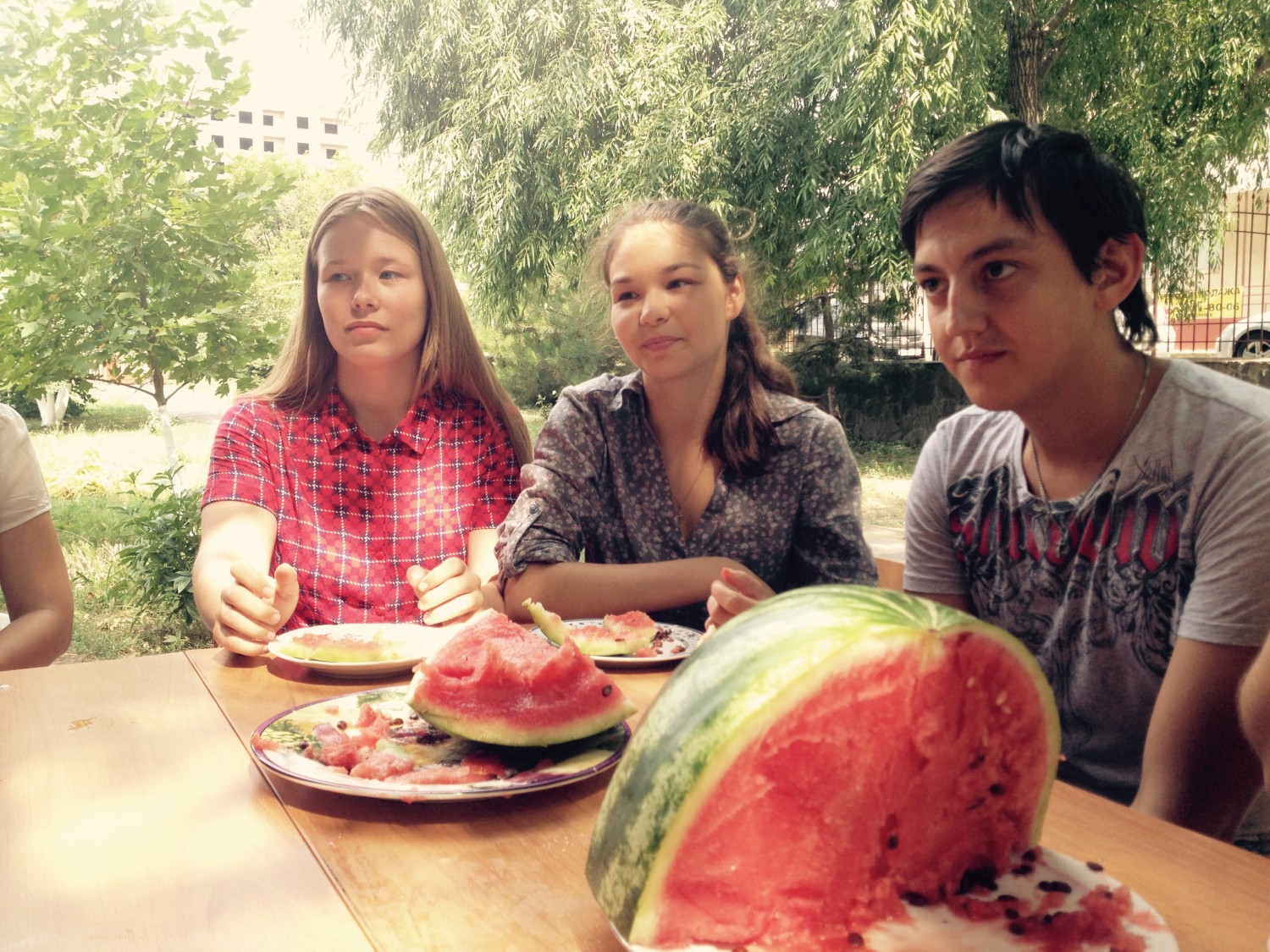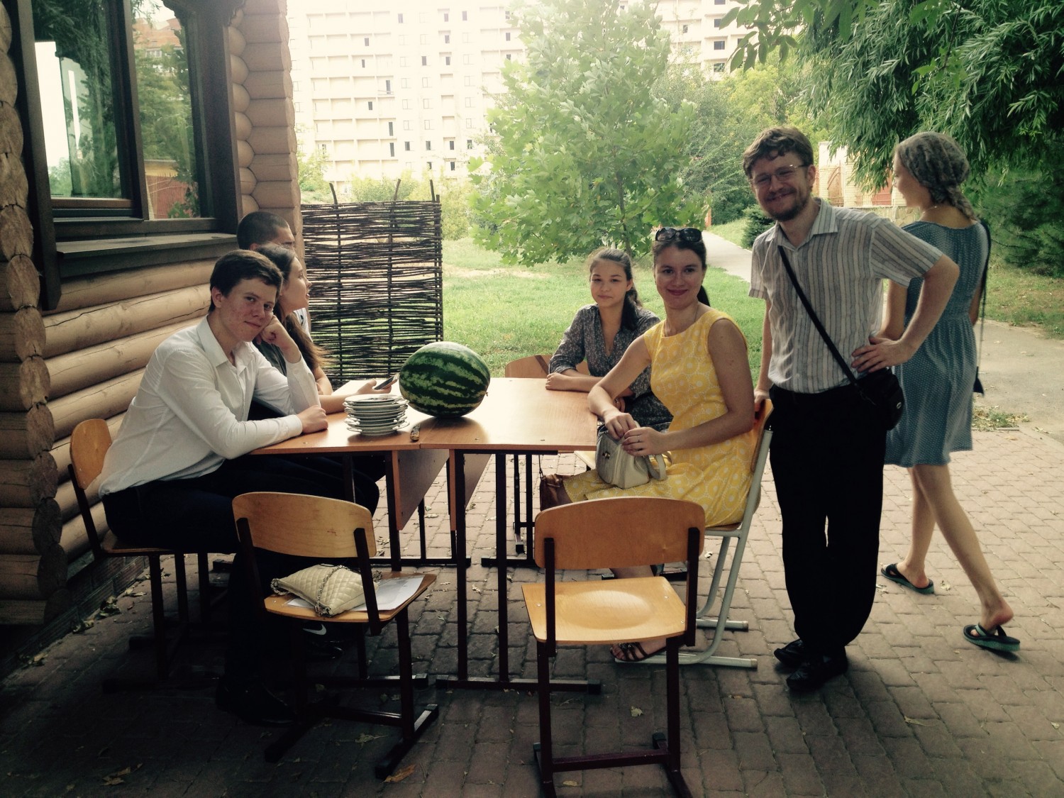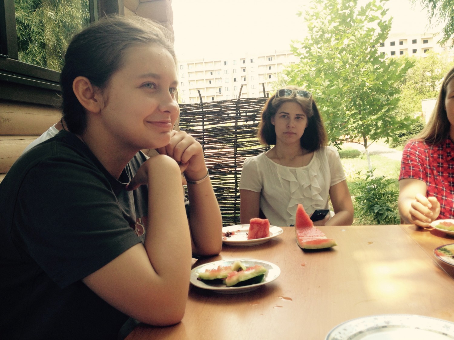 Мы знакомились с новыми участниками клуба, ели большой арбуз, потом мороженое:), обсуждали наши достижения за август 2014-август 2015 гг, планировали деятельность на 2015-2016 гг.