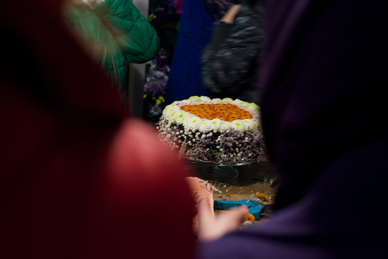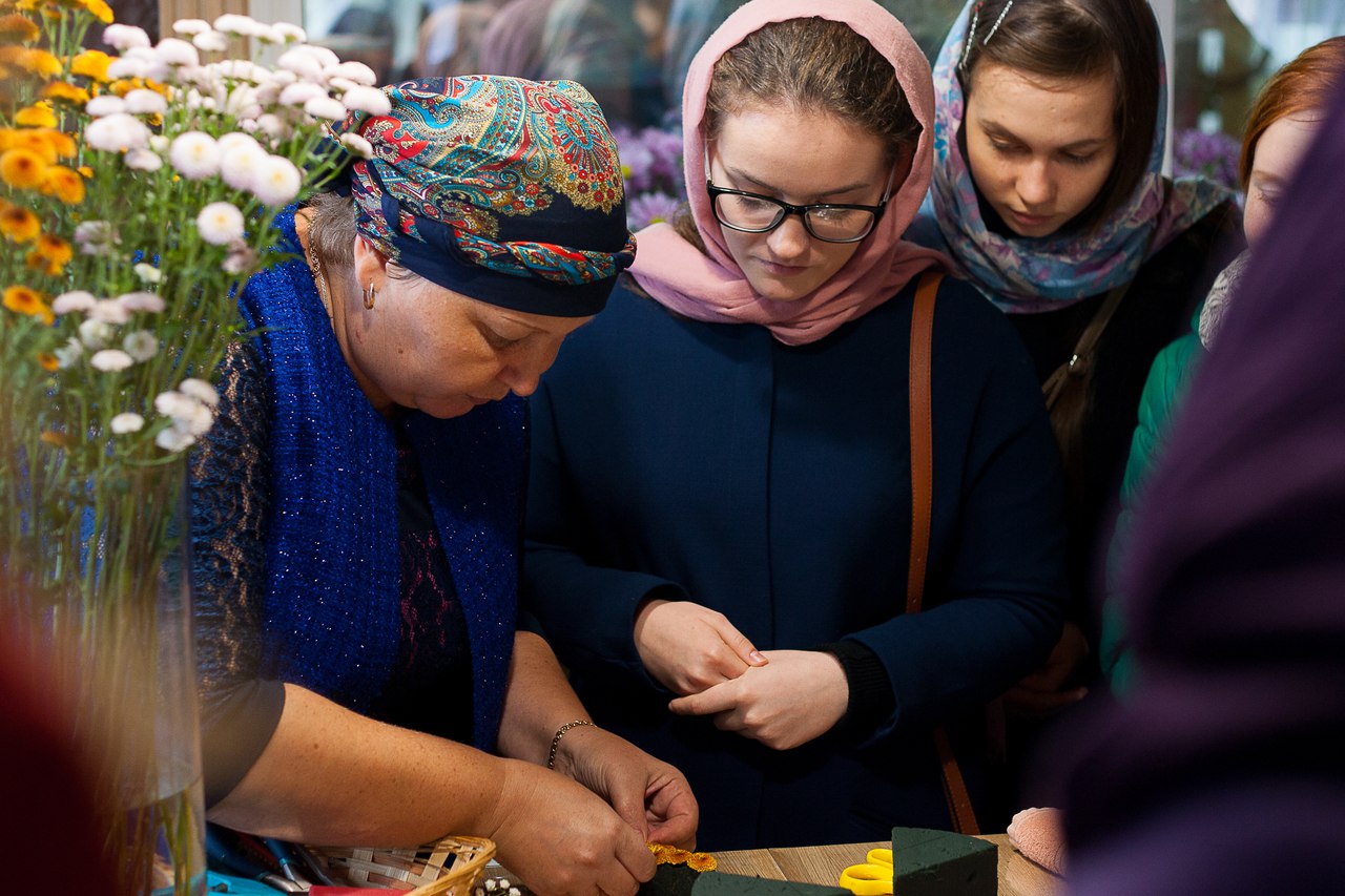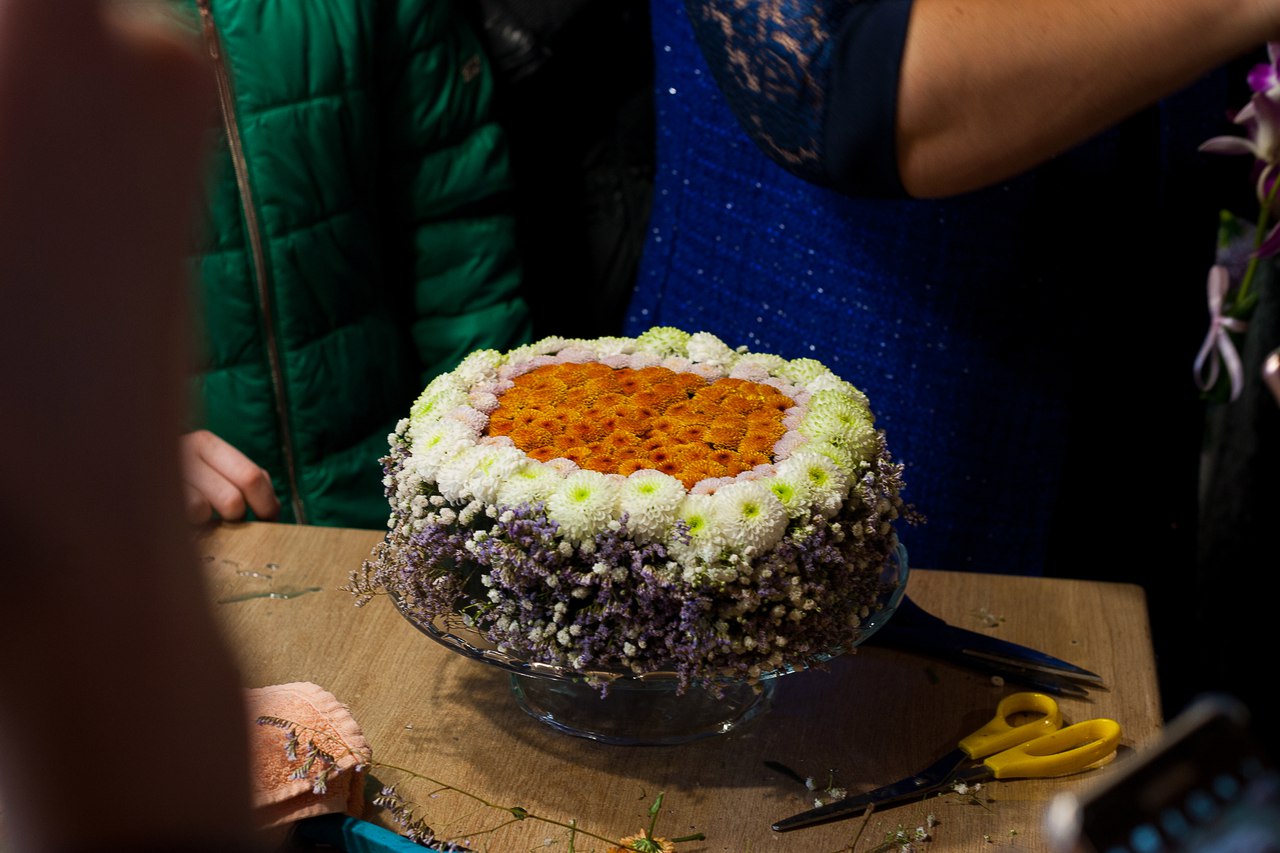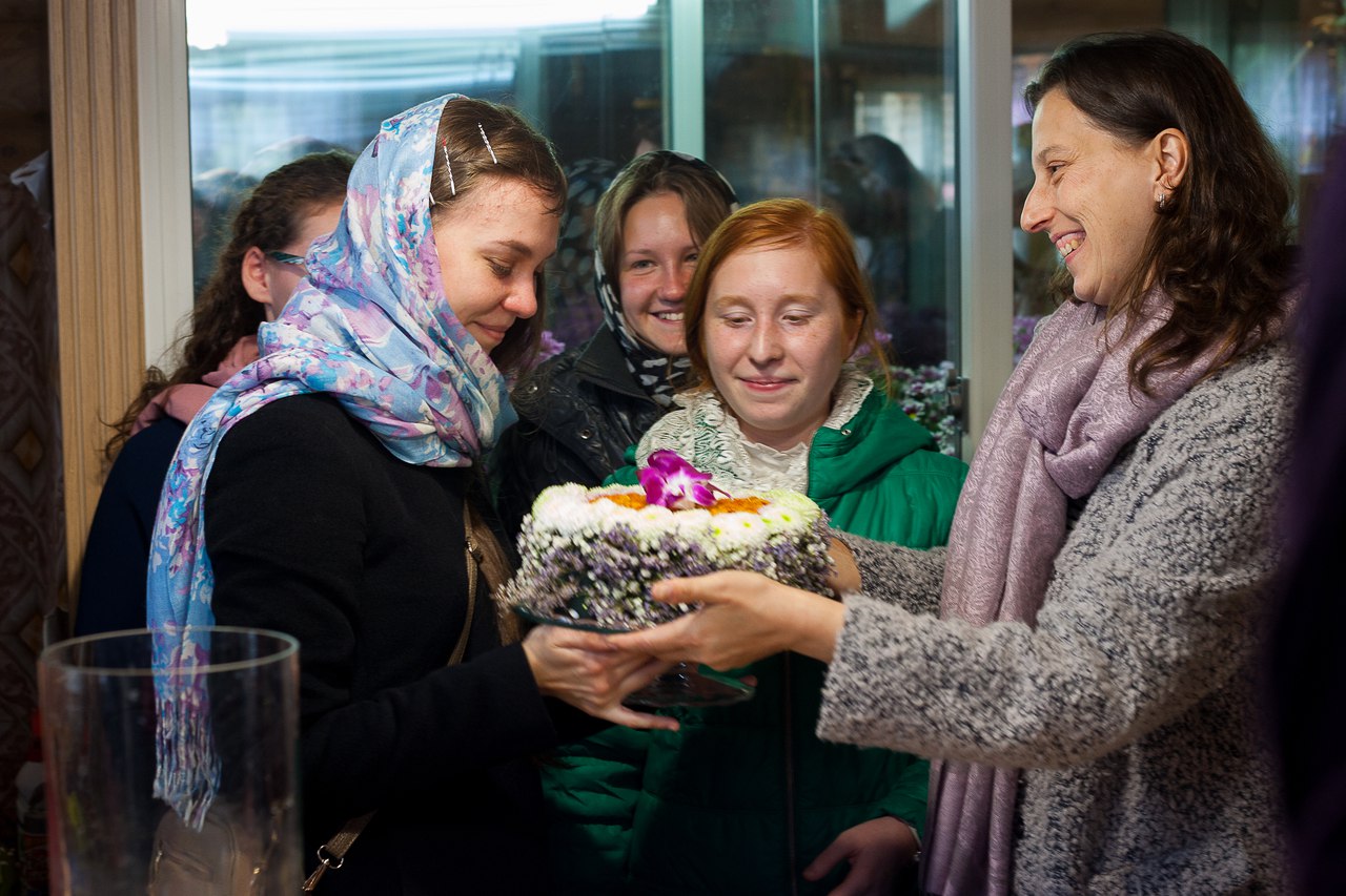 В школе флористики студентки сами смогли поучаствовать в создании «Цветочного торта», кусочки которого каждая девушка сделала собственноручно под присмотром Инги Колесниковой. Букет впоследствии подарили имениннице этого дня, воспитаннице 2 курса регентско-певческого отделения Валерии.