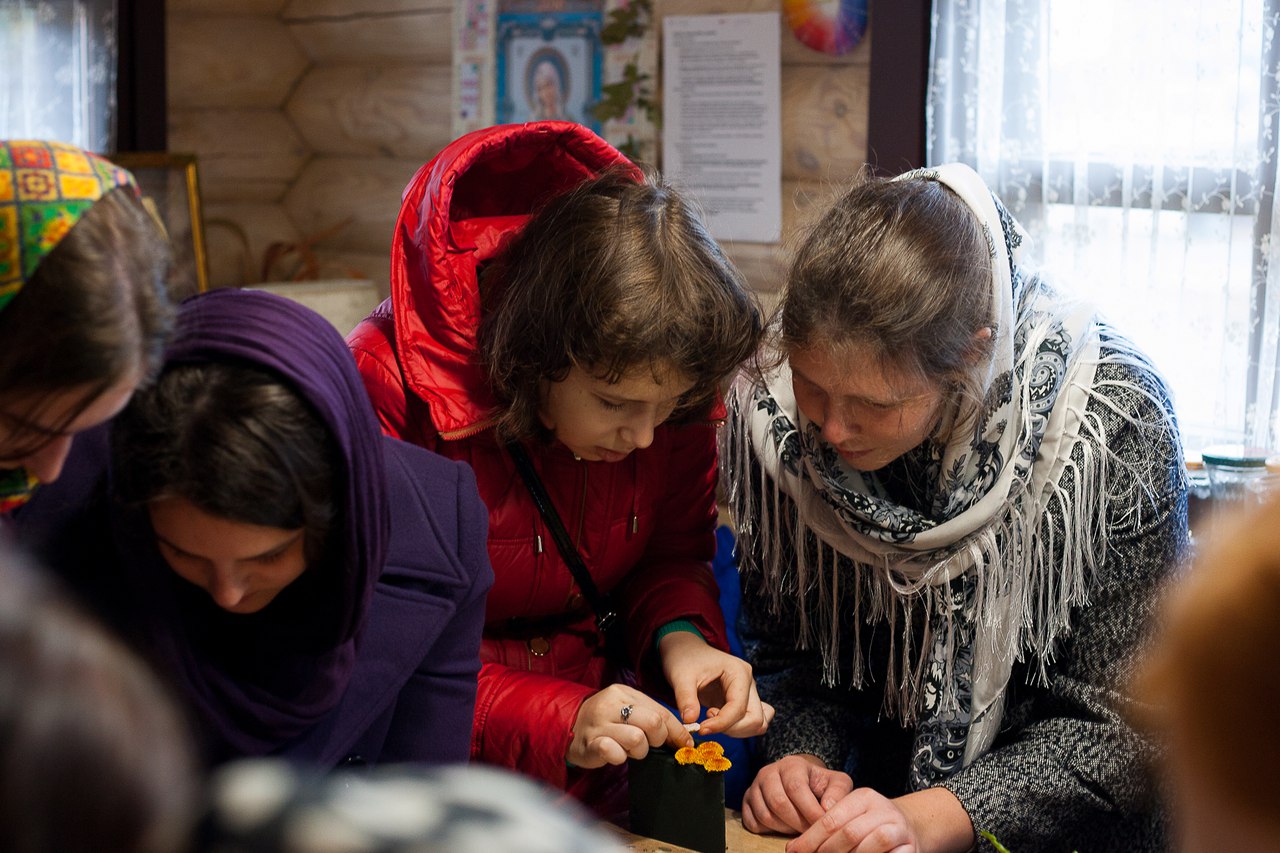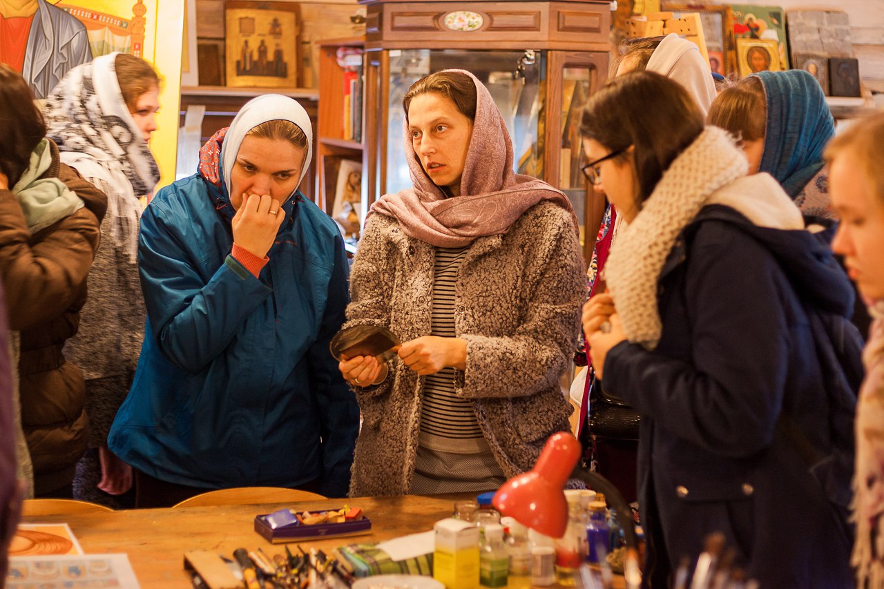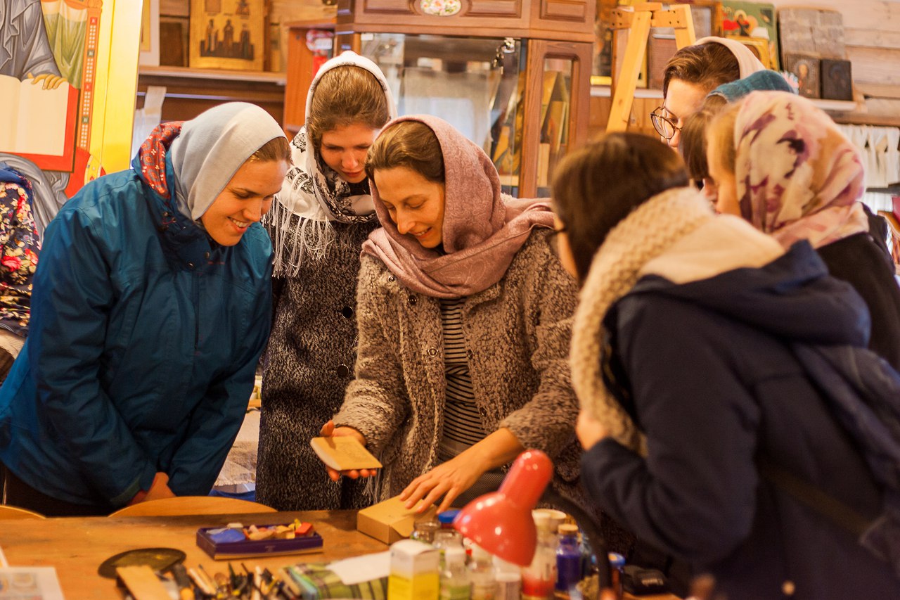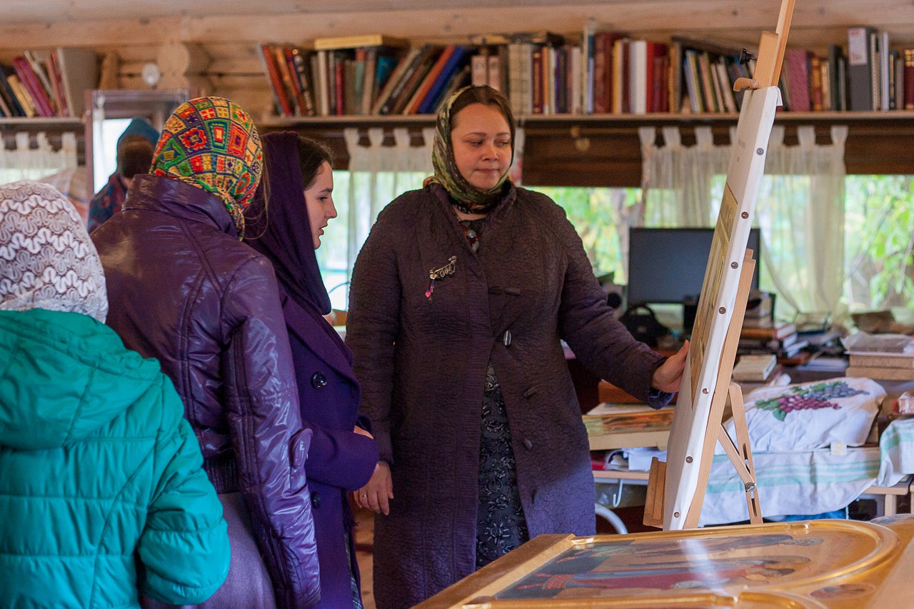 Экскурсию по мастерским провела матушка Ксения Волощук и рассказала, как вышиваются и пишутся иконы, показала великолепные работы храмовых мастериц.