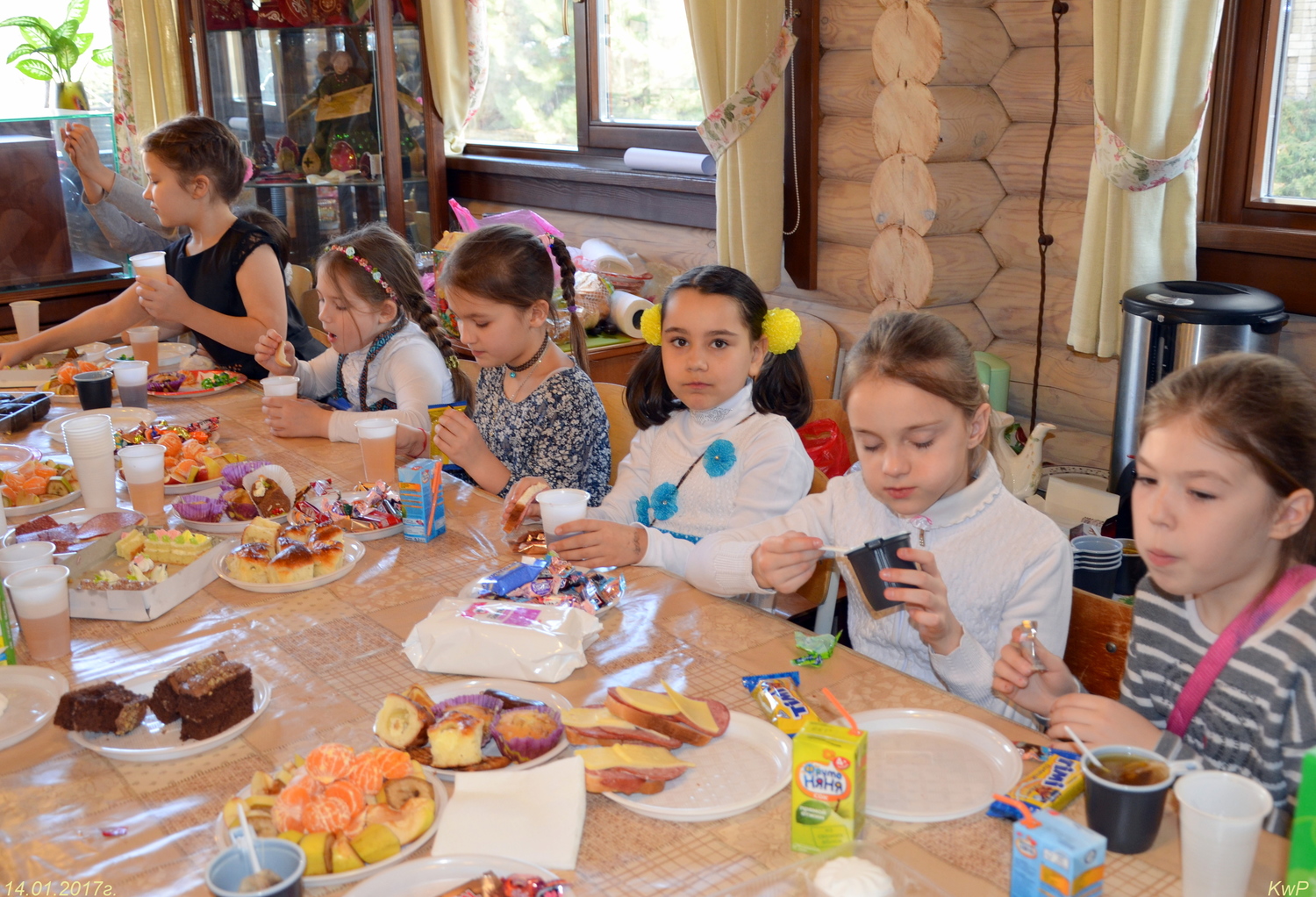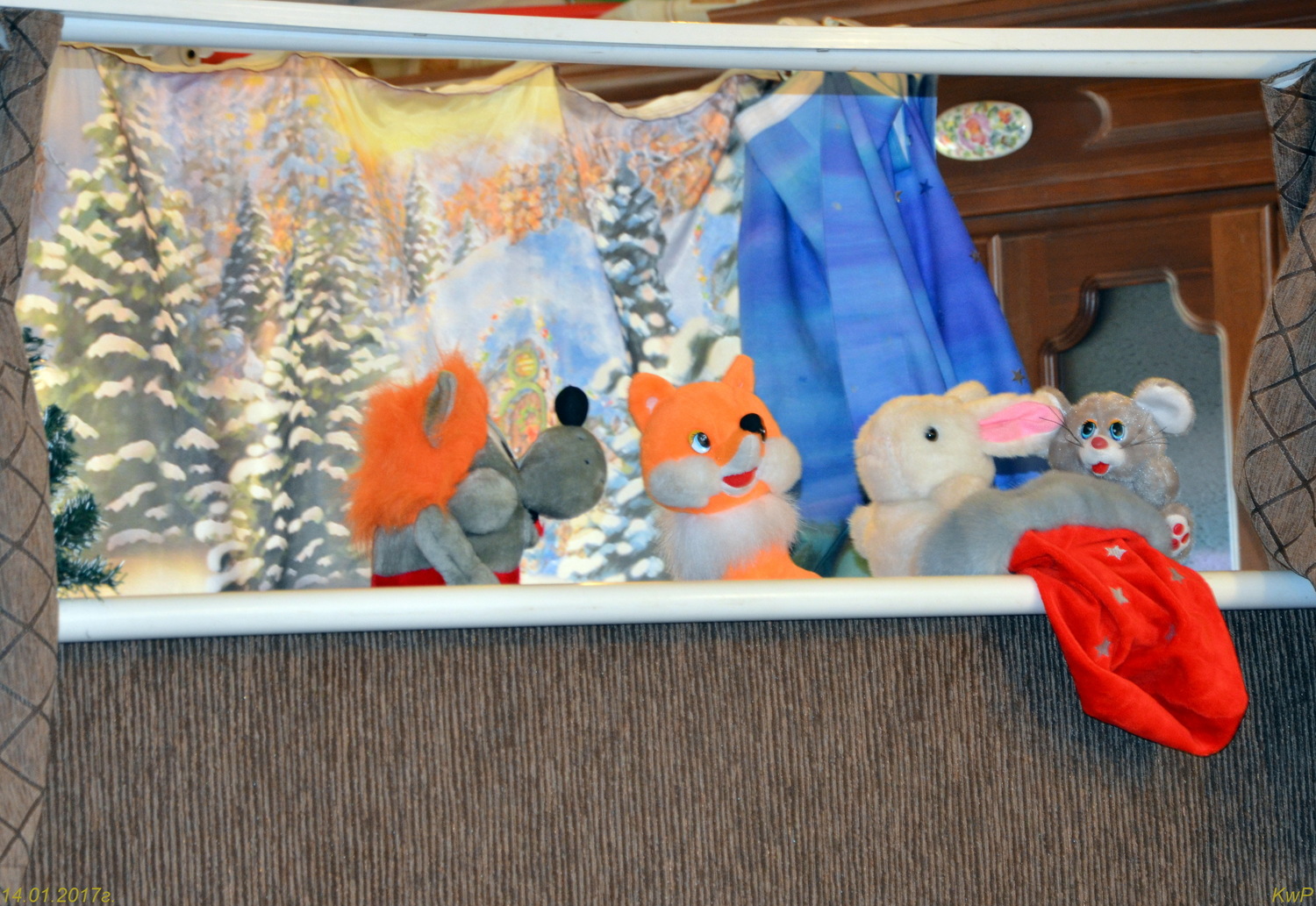 А ещё на Святках принято ходить друг к другу в гости. Вот и наши дети отправились в лес к друзьям — лесным зверятам. Это путешествие помогли осуществить артисты младшей группы кукольного театра "Пуговки", показав для малышей сказку "Рождественская рукавичка". Ну и конечно же, порадовали детей сладкие подарки! Родительский комитет каждой группы организовал для детей и гостей прекрасные праздничные столы.