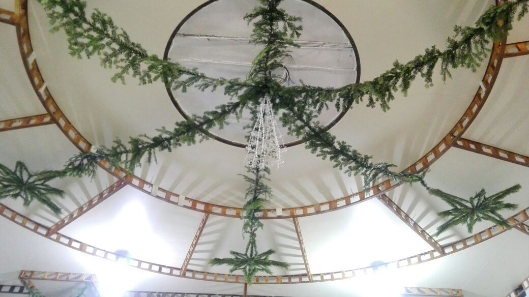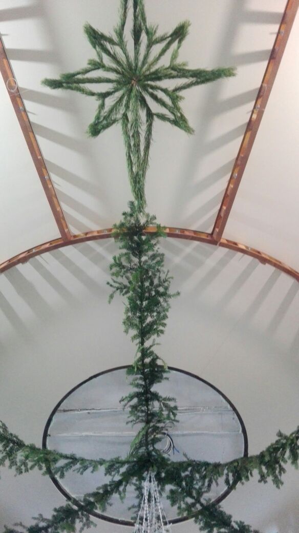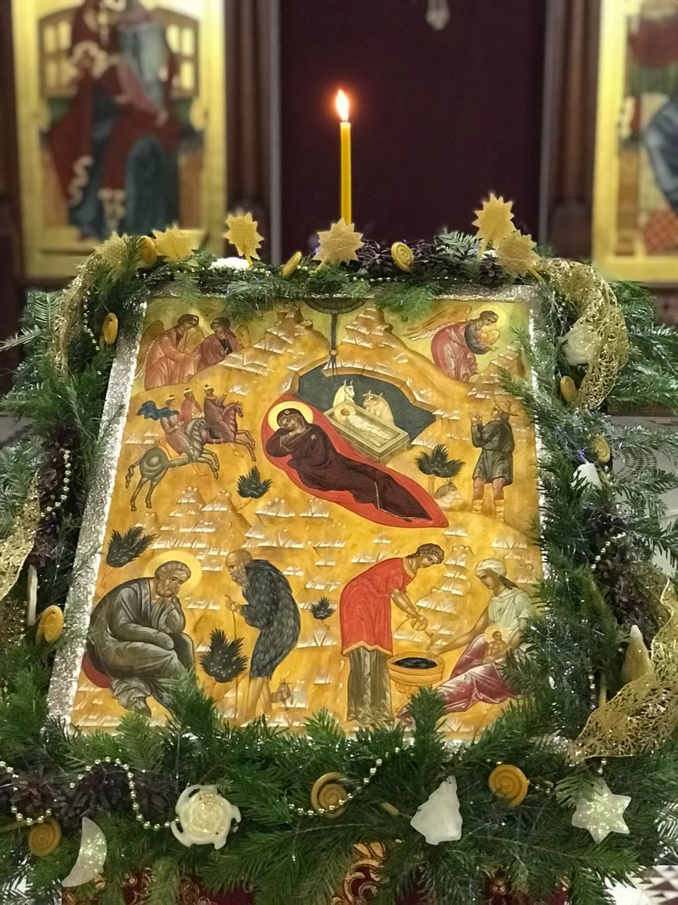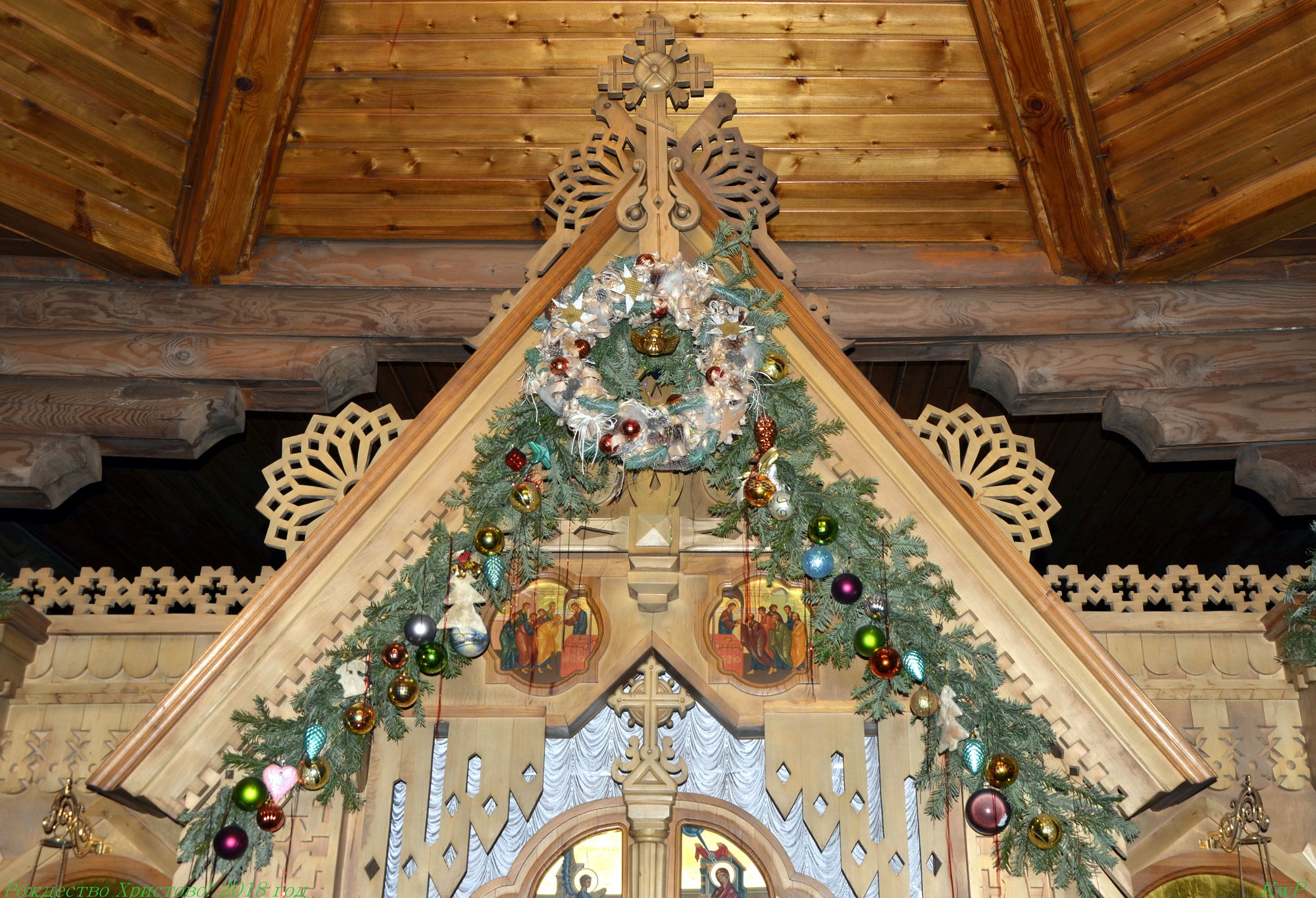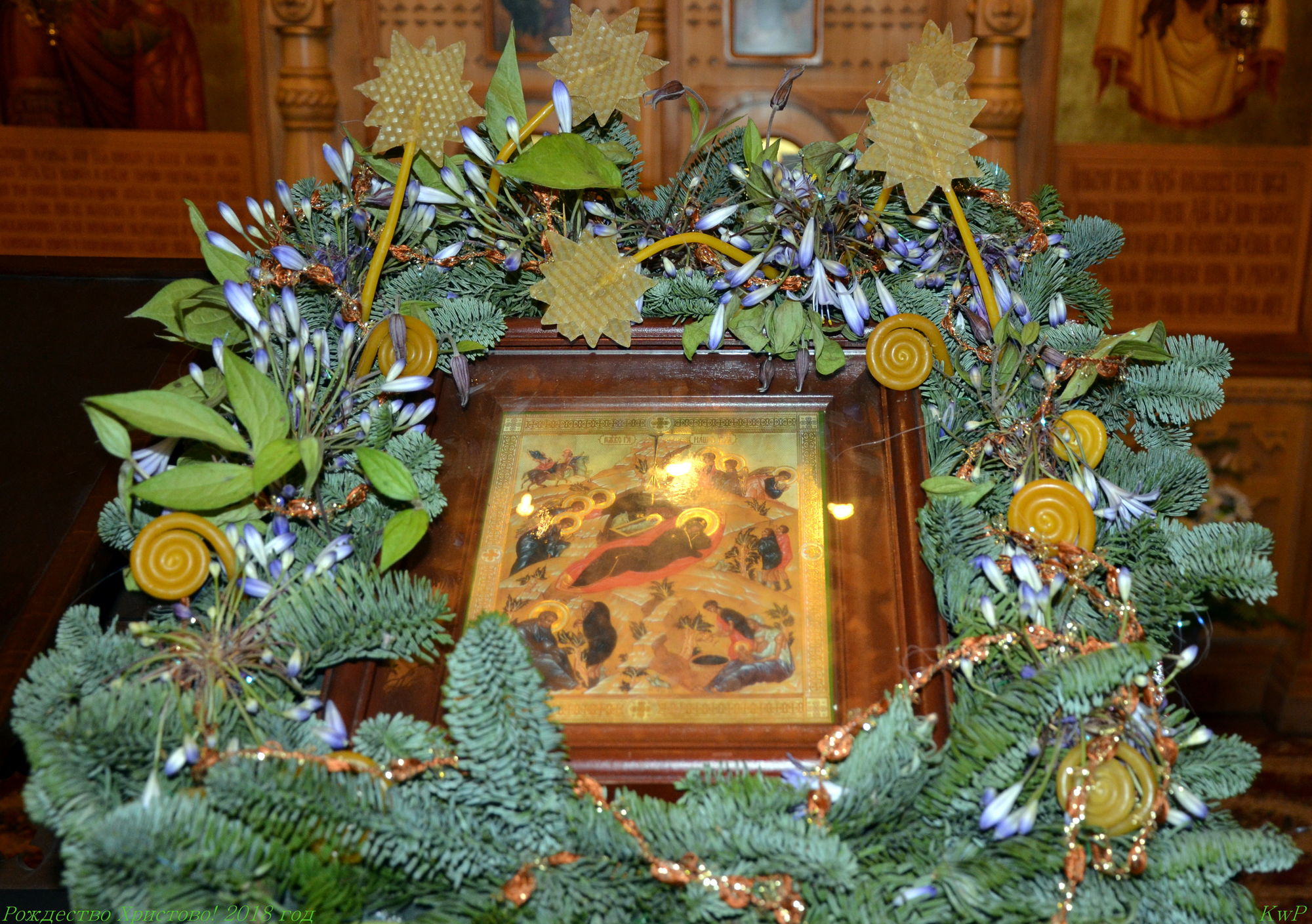 Храмовая мастерская флористики и дизайна благодарит учеников, прихожан, участников молодежного движения и всех, кто принимал участие в подготовке украшения храмов к Рождеству Христову, за неоценимую помощь. В оформлении были использованы: хвоя пихты кавказской, шишки сосны крымской, лоза виноградная, мох, яблоки. мандарины, фигурки из парафина и соленого теста, ангелы из бумаги и ткани, ростовые ангелы. Идея Храмовой мастерской флористики и дизайна.