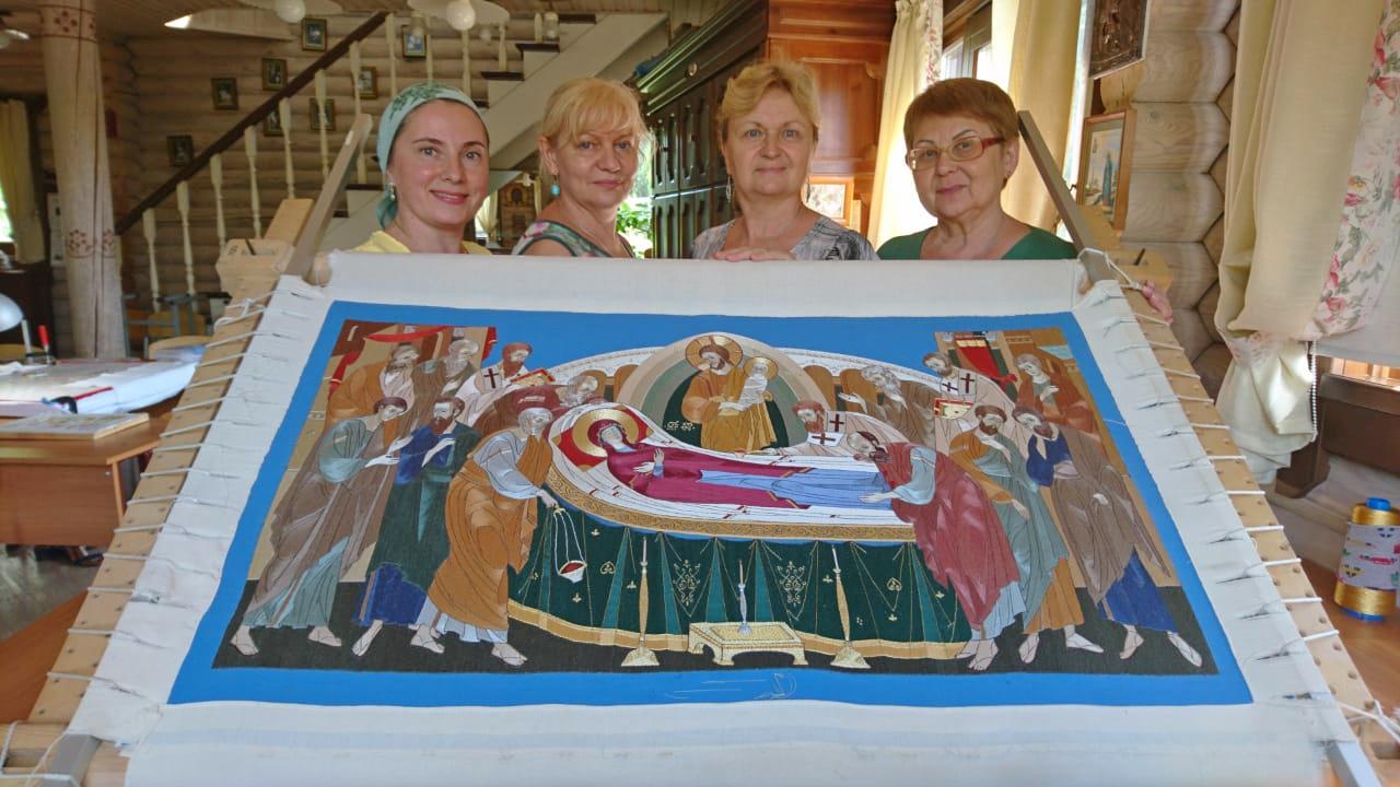 В золотошвейной мастерской закончена работа над вышивкой плащаницы. Готовится ее сборка. Заказан проект тропаря. Эскиз прориси плащаницы и рисунок в цвете сделал наш иконописец Дмитрий Александрович.
