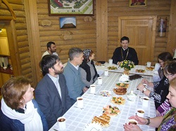 Во время трапезы, устроенной для гостей сестричеством прихода, заведующий сектором Дополнительного образования ДДС священник Александр Усатов обсудил с учащимися Курсов практические вопросы проведения огласительных бесед с восприемниками младенцев, взрослыми оглашенными, а также подготовительных бесед перед вступлением в Церковный брак.