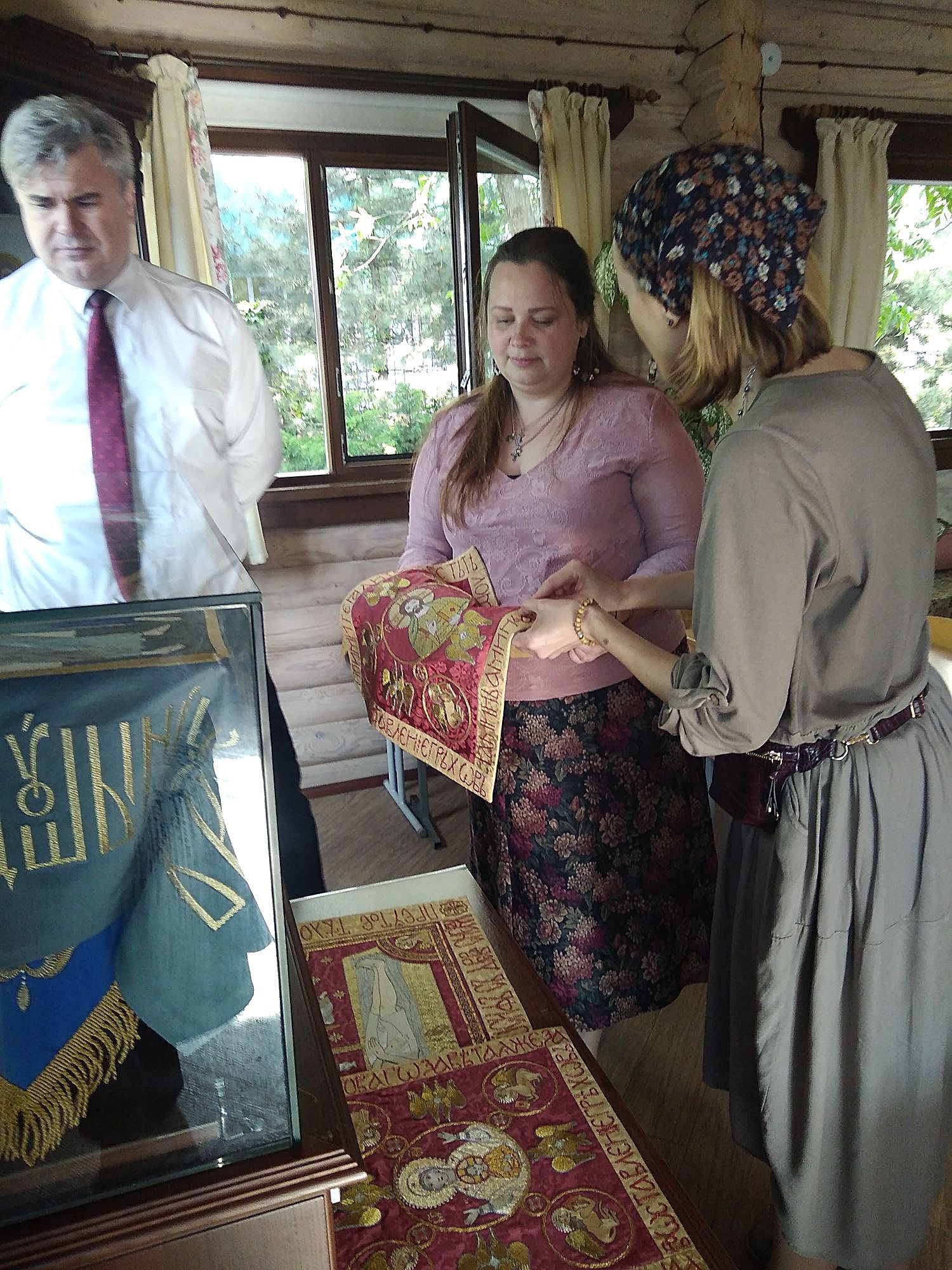 Гостей познакомили с руководителями флористической, золотошвейной и иконописной мастерской. Флористы рассказали об уникальных растениях, посаженных на территории нашего прихода. Золотошвейная мастерская показала работы, выполненные вручную с использованием натуральных материалов таких, как шелк, золотые и серебряные нити, жемчуг, канитель, трунцал. Иконописцы рассказали об иконах, над которыми сейчас ведется работа. Руководитель духовно-патриотического центра Чуцков Виктор Иванович рассказал об уроках мужества, проводимых с ребятами.