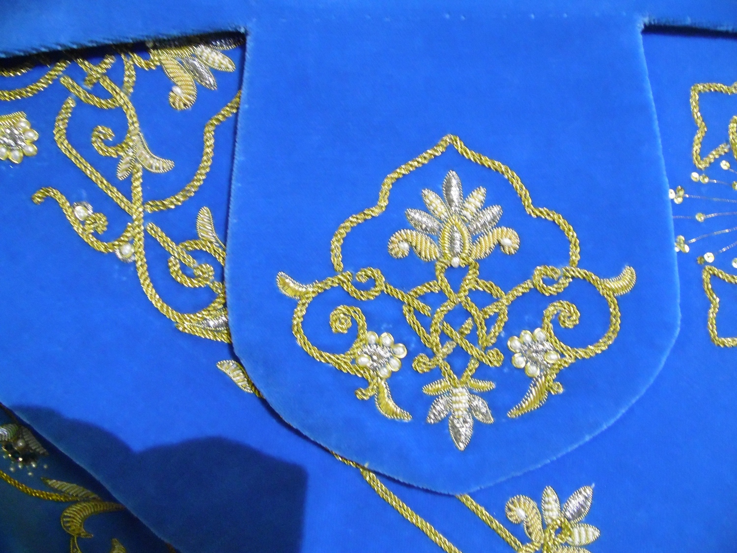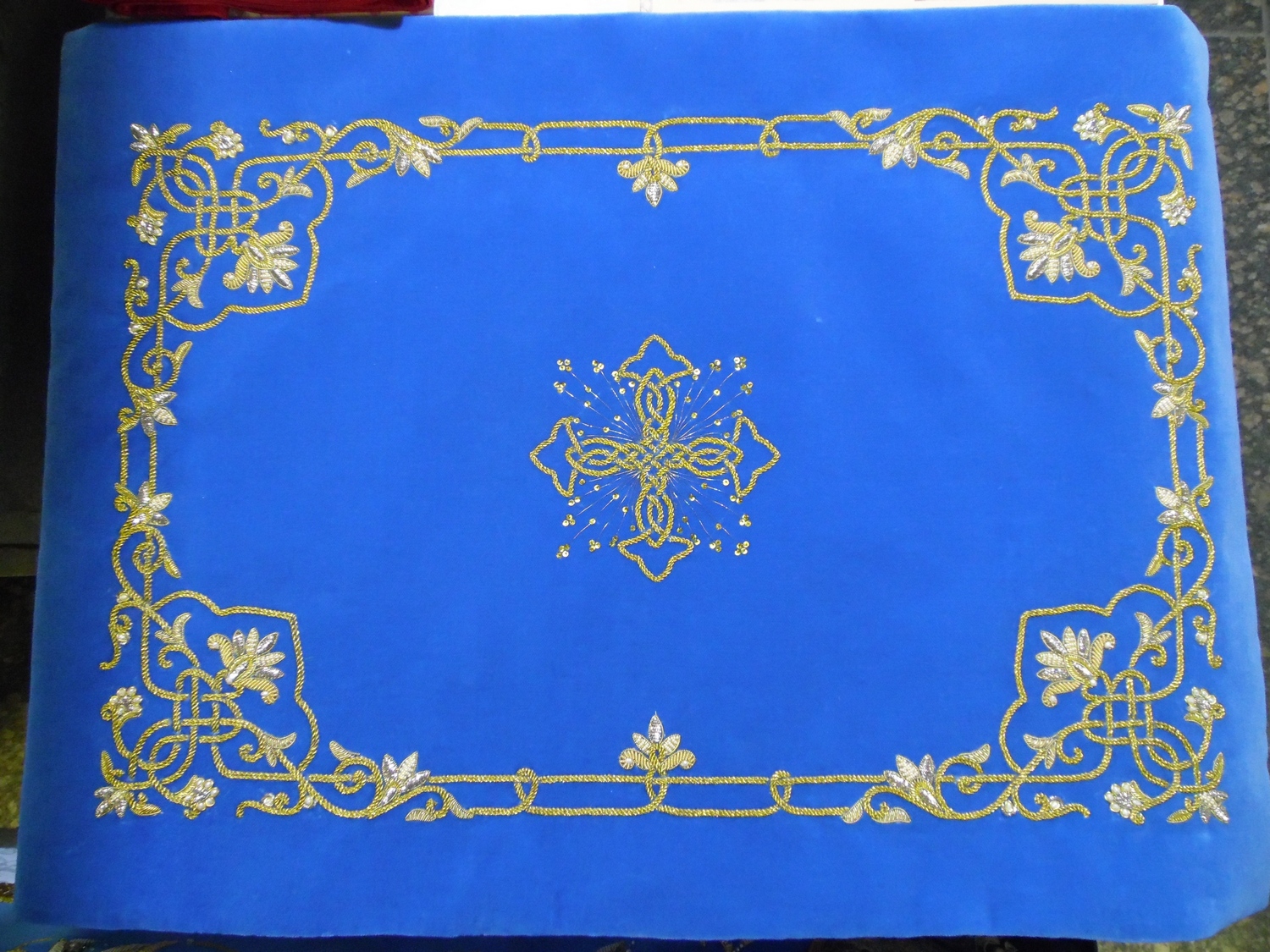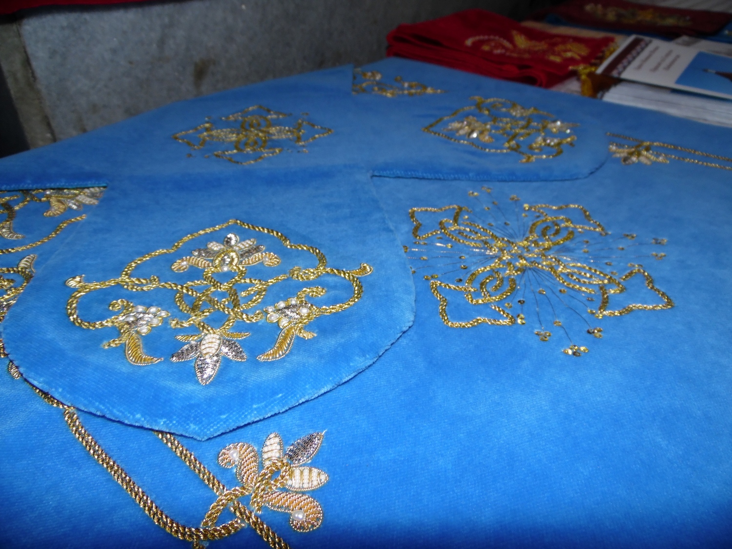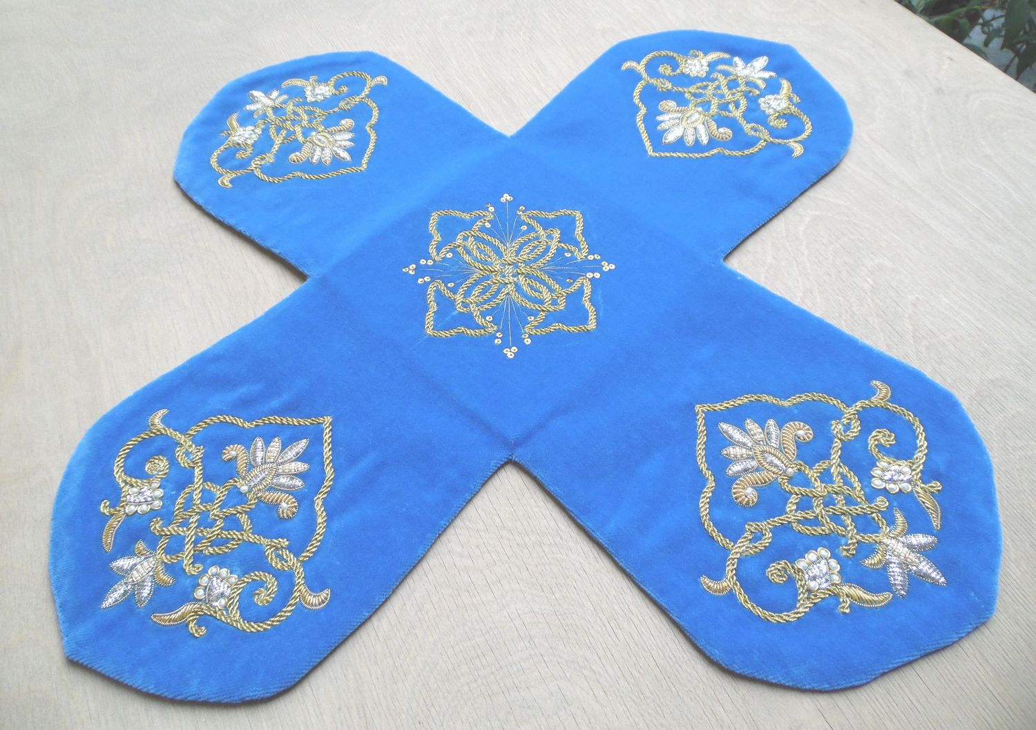 В золотошвейной мастерской завершена работа над Литургическим комплектом в наш Храм. Работа выполнена на бархате, в технике шитья золотными шнурами и канителью.