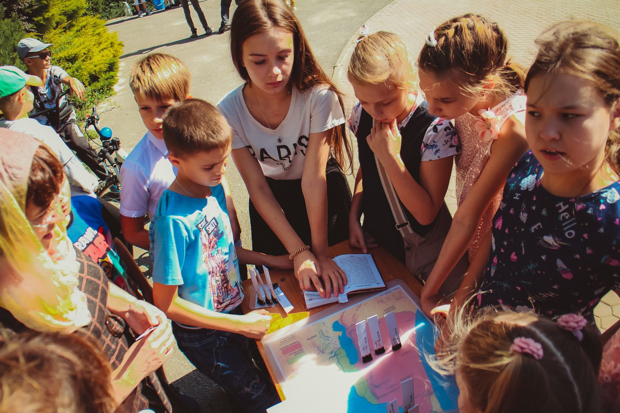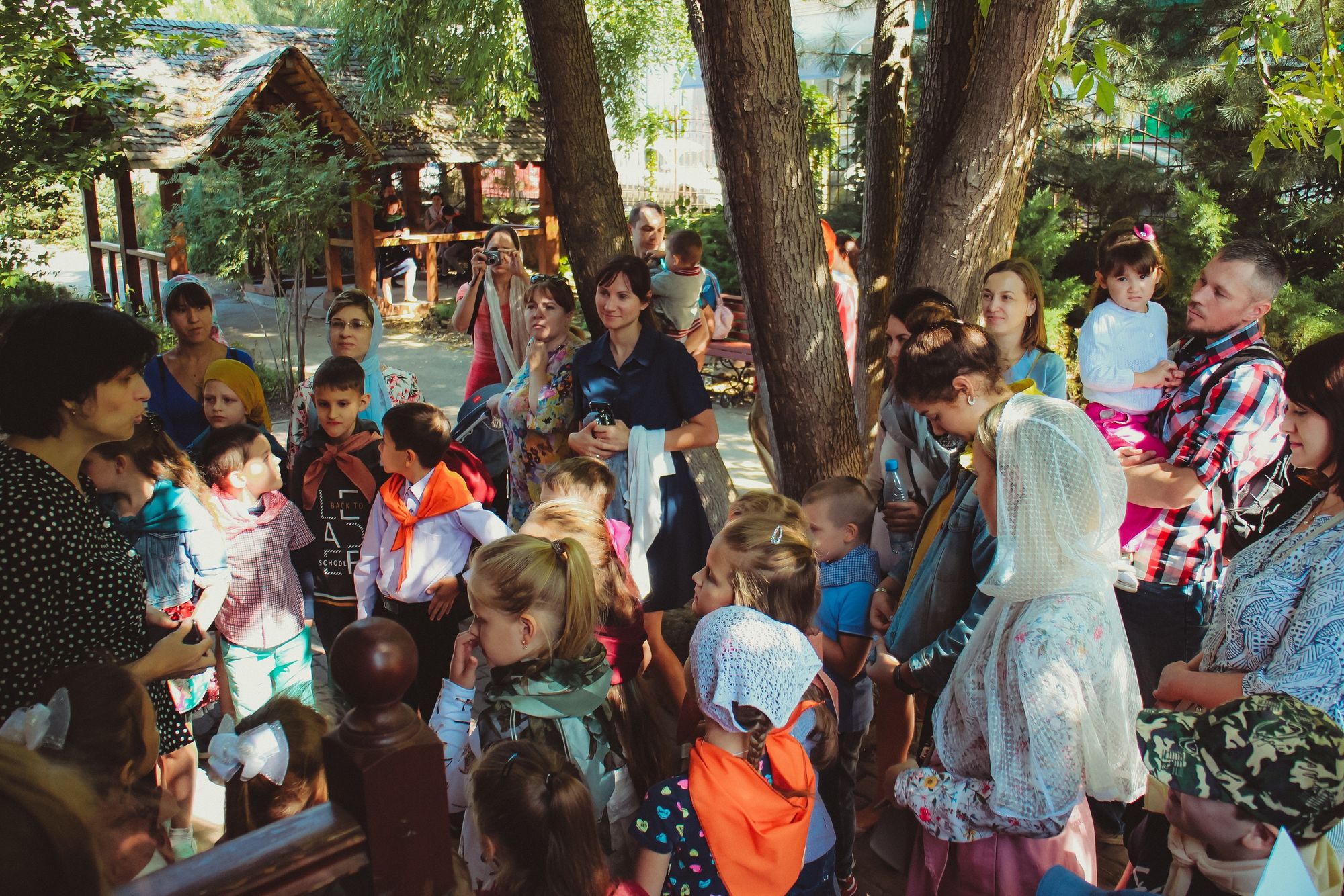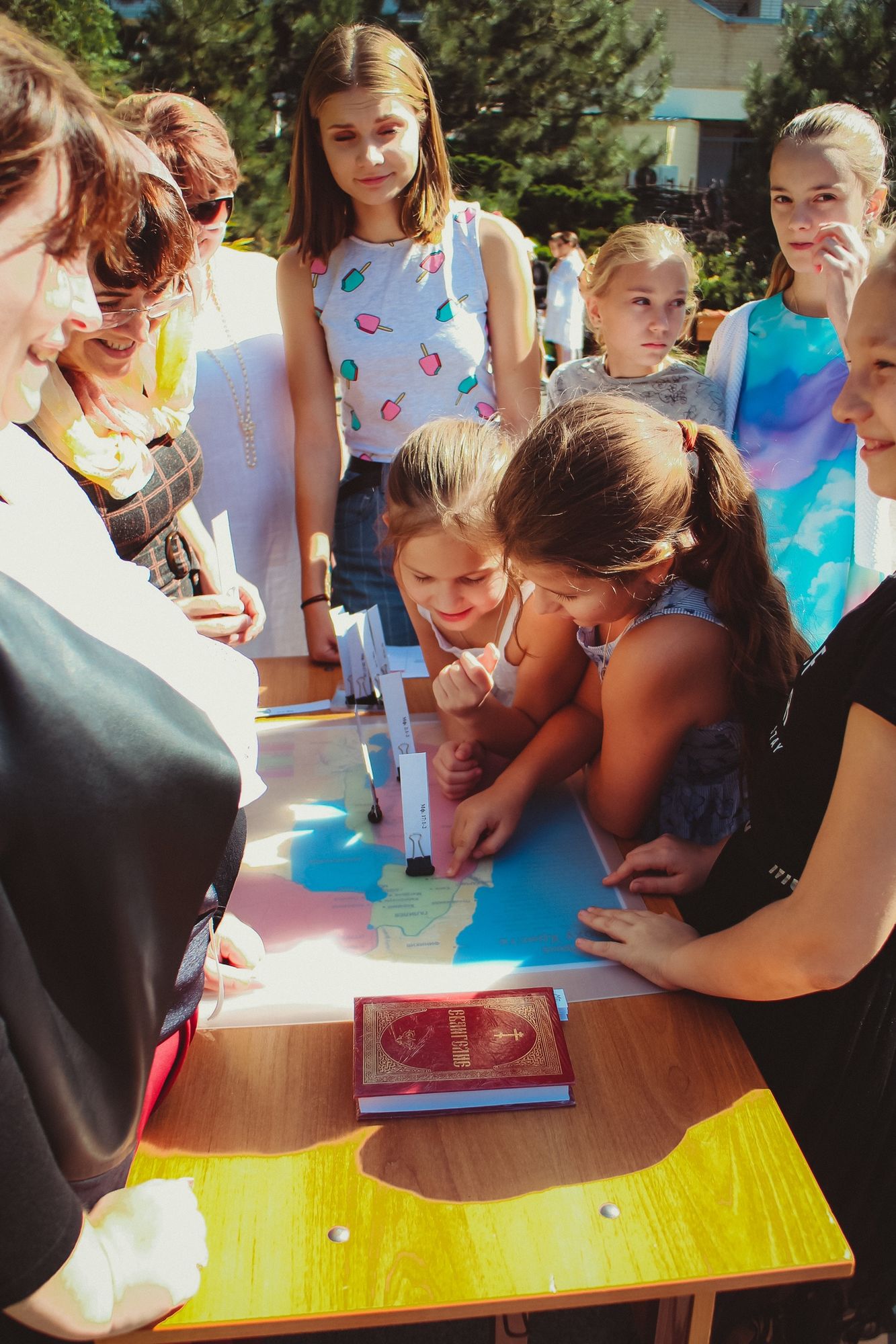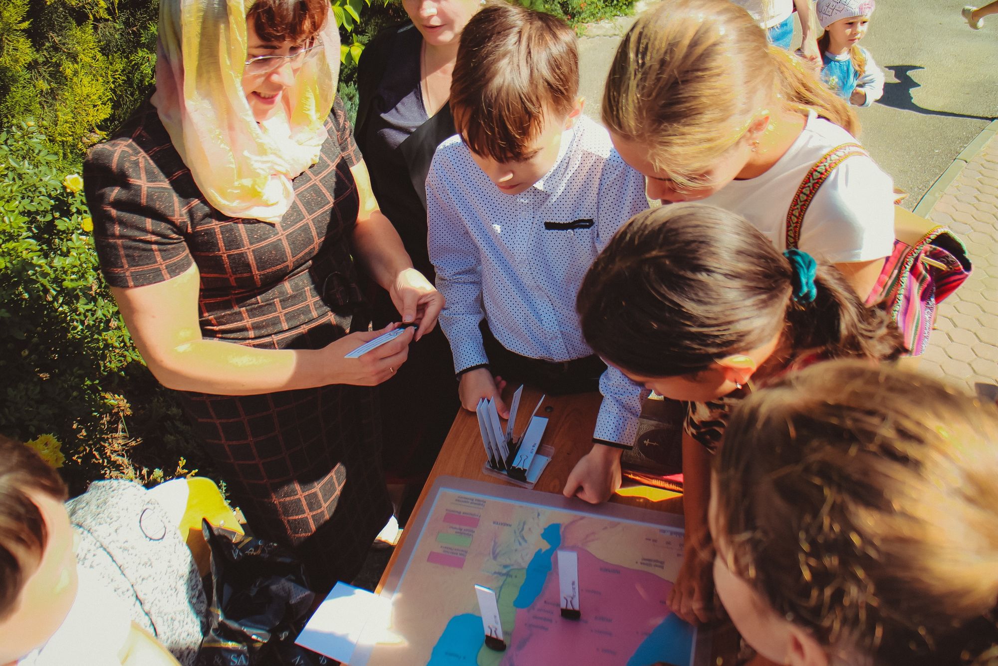 После чего младшие группы воскресной школы познакомились с приходом на занимательной экскурсии. А учащиеся средних, старших групп и родители поделились на команды и отправились на маршрутную игру. На каждой станции их ждали педагоги, которые приготовили увлекательные задания по предметам, изучаемым в воскресной школе.