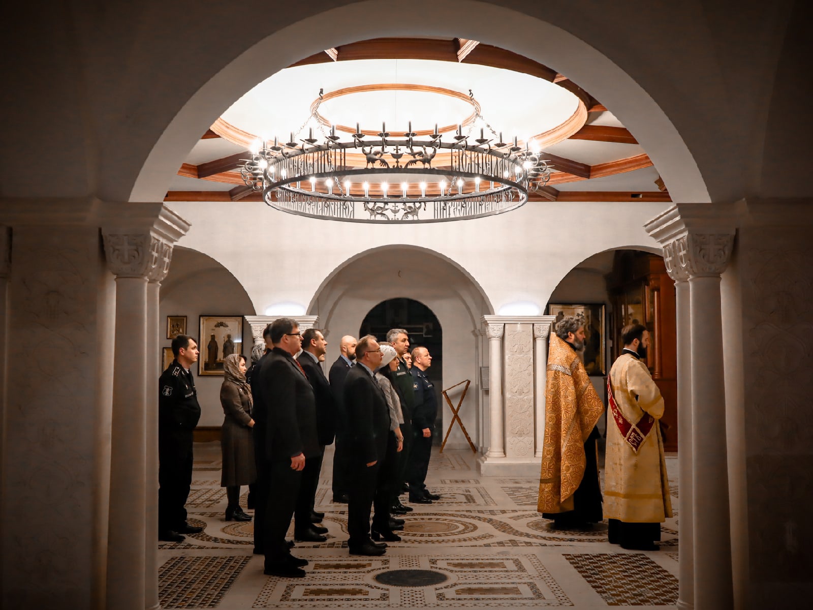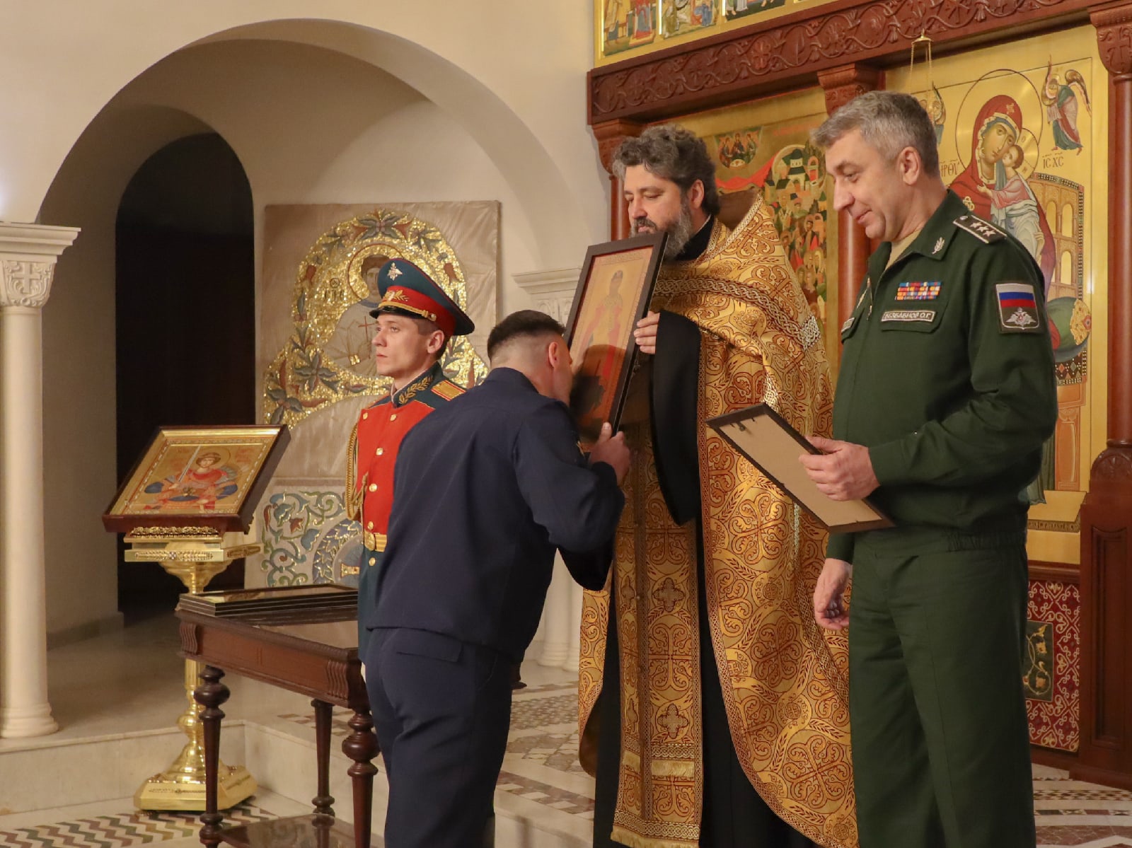 Отец Валерий провел экскурсию по храму, познакомил с жизнью и деятельностью прихода. Рассказал о взаимодействии с округом и о совместных планах по благоустройству главного храма ЮВО. Также был отслужен молебен святому благоверному князю Ярославу Мудрому, который, определением Святейшего Патриарха и всея Руси Кирилла, является небесным покровителем юридической службы Вооруженных Сил Российской Федерации. По завершении молебна отец Валерий передал благословение и иконы с изображением святого покровителя.