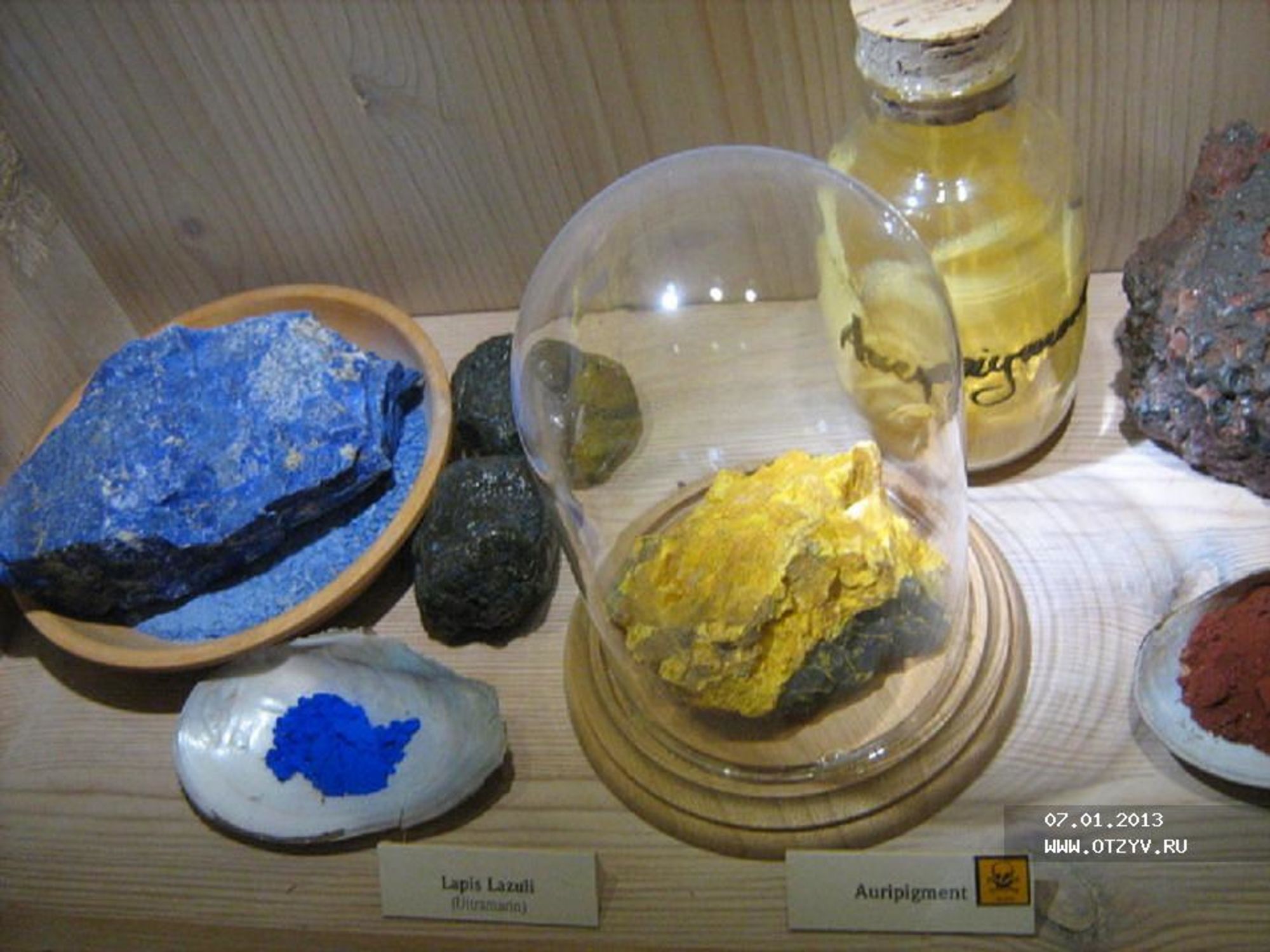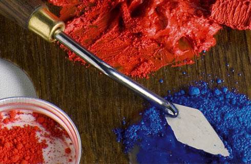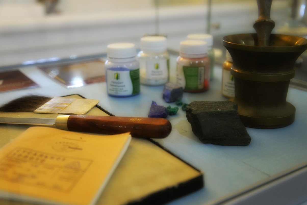 В нашей мастерской для написания икон иконописцы сами готовят краски из минеральных пигментов, растирают, добавляют яичную эмульсию и воду. Так в иконе Господь Вседержитель хитон написан краской из кристаллов киновари, а гиматий лазуритом из Афганистана и много других пигментов в сложных смесях, и тонких лессировках применяются для написания Божественной красоты!