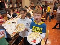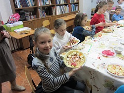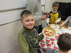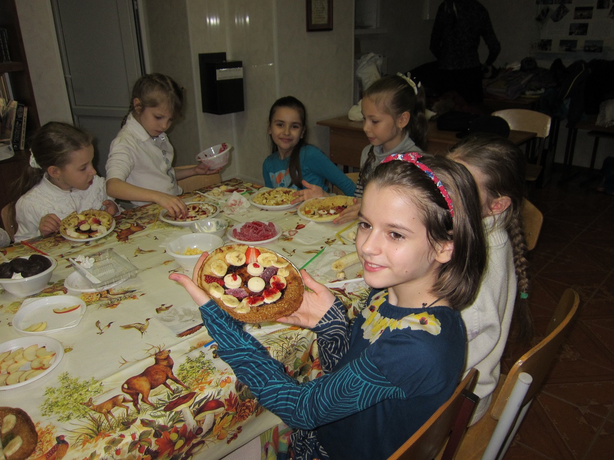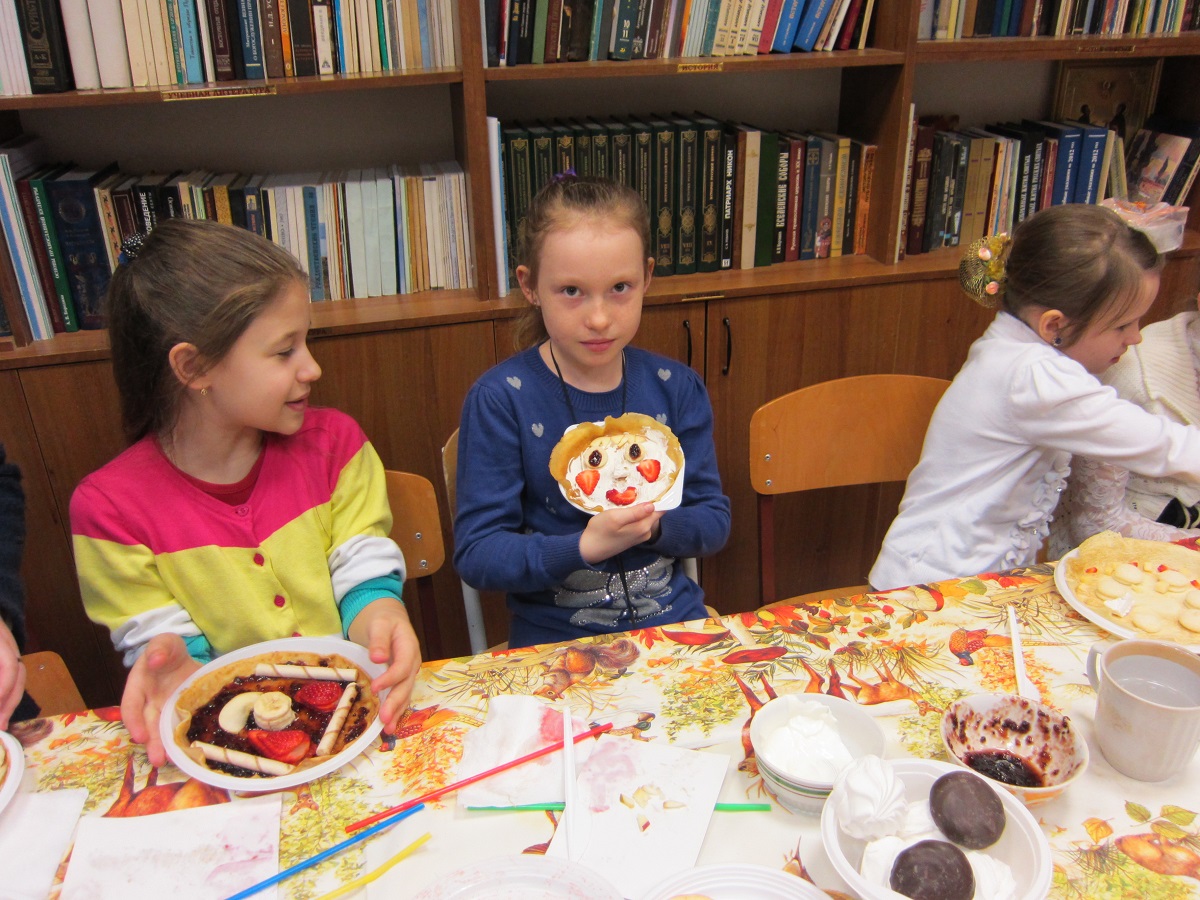 Следующий урок, – «Творчество и рукоделие», при активной поддержке родителей превратился в «Фестиваль веселого блина». Мамы напекли блинов, и каждый из 28 присутствующих на уроке ребят создавал свой авторский проект по их украшению. В ход шли и сметана, и варенье, и зефир, и мармелад, и фрукты. Умельцы и названия давали своим блюдам: «Негритенок», «Улыбка», «Мальвина», «Веселый человек», «Портрет подруги», «Поросенок»
